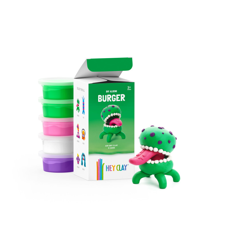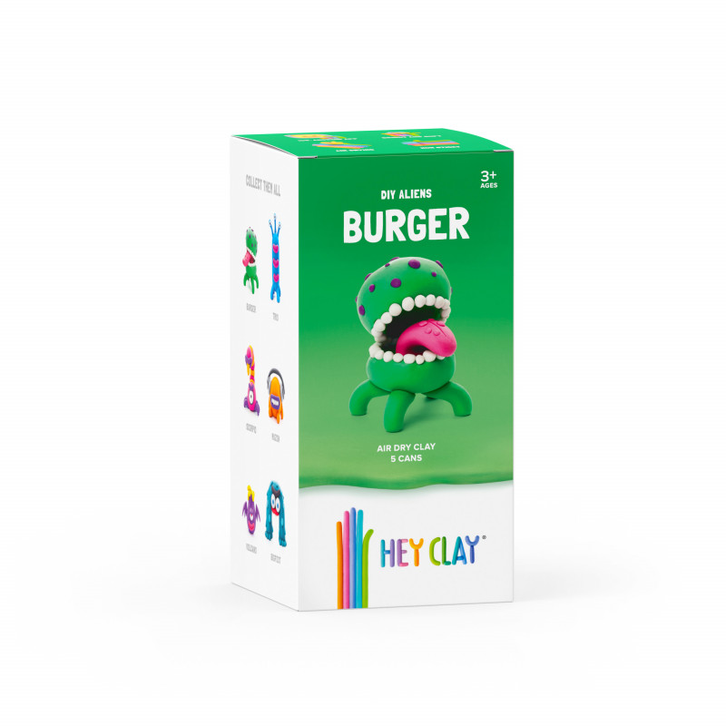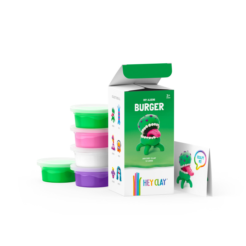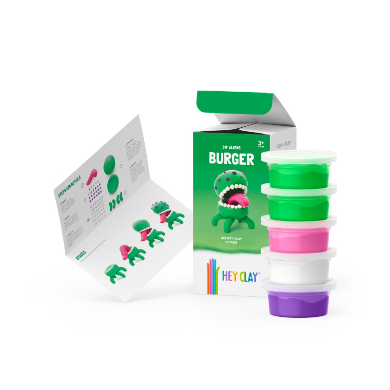 Innehåll: 5 burkar lufttorkande lera (totalt ca 75 g lera i 4 färger) samt ett informationsblad med bilder på utomjordingen, de olika stegen som krävs för att skulptera den, en länk till där ni kan hämta appen och koden som låser upp appens guide för hur man skapar Burger.