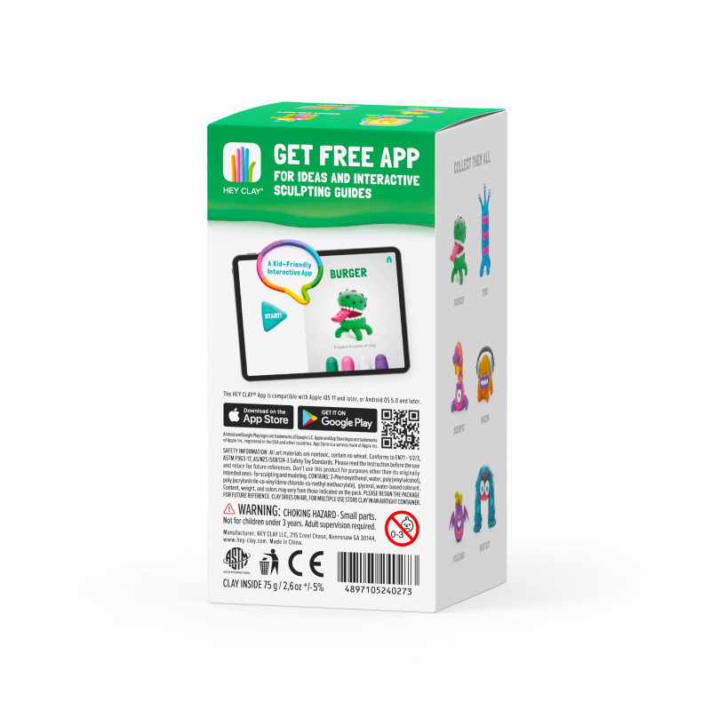 Ett riktigt kul och kreativt set med lufttorkande lera för att skapa den roliga utomjordingen Burger av, som du sen kan leka med eller dela bilder av med dina vänner. Detta set innehåller 5 burkar lätt, mjuk, elastisk och färggrann lera som kan ta form med hjälp av en gratis barnvänlig app med interaktiva video-guider som har enkla steg-för-steg instruktioner (på engelska) för hur man skulpterar olika karaktärer. Du låser upp beskrivningen för Burger med en kod som finns inuti paketet. Låt dig inspireras av appen och skapa roliga karaktärer av den mjuka och färgstarka leran, låt figuren lufttorka i 24 timmar så kan du sen leka med den precis som en leksak eller dela bilder på dina skapelser med dina vänner. Guiden med steg-för-steg instruktionen visar alla grundläggande tekniker för att skulptera i lera och snart kommer barnen längta efter att skapa sina helt egna figurer. Leran är lufttorkande, klibb-fri, giftfri, innehåller inget vete och har klara, livfulla färger som går att blanda ihop. Tvätta händerna efter användning och undvik att leran får kontakt med mun, ögon, mat eller dryck, vatten, fukt samt eld.