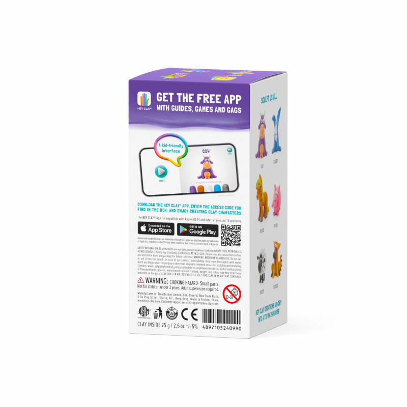 Ett riktigt kul och kreativt set med lufttorkande lera för att skapa en rolig ko av som du sen kan leka med eller dela bilder av med dina vänner. Detta set innehåller 5 burkar lätt, mjuk, elastisk och färggrann lera som kan ta form med hjälp av en gratis barnvänlig app med interaktiva video guider som har enkla steg-för-steg instruktioner (på engelska) för hur man skulpterar olika karaktärer. Du låser upp beskrivningen för kon med en kod som finns inuti paketet. Låt dig inspireras av appen och skapa roliga karaktärer av den mjuka och färgstarka leran, låt figuren lufttorka i 24 timmar så kan du sen leka med den precis som en leksak eller dela bilder på dina skapelser med dina vänner. Guiden med steg-för-steg instruktionen visar alla grundläggande tekniker för att skulptera i lera och snart kommer barnen längta efter att skapa sina helt egna figurer. Leran är lufttorkande, klibb-fri, giftfri, innehåller inget vete och har klara, livfulla färger som går att blanda ihop. Tvätta händerna efter användning och undvik att leran får kontakt med mun, ögon, mat eller dryck, vatten, fukt samt eld.
