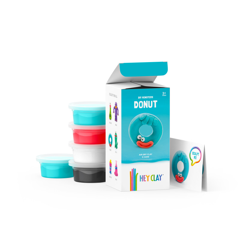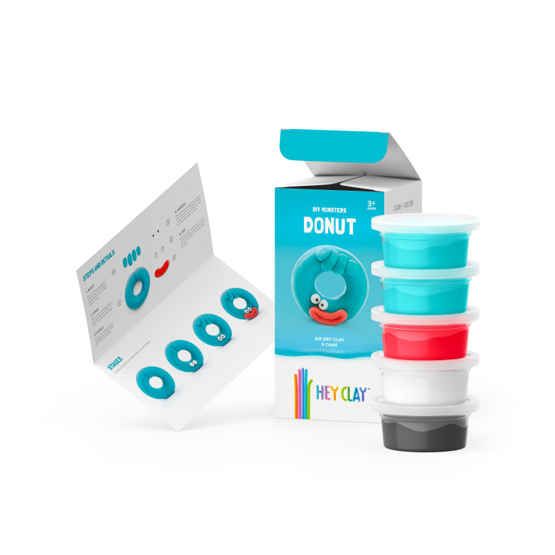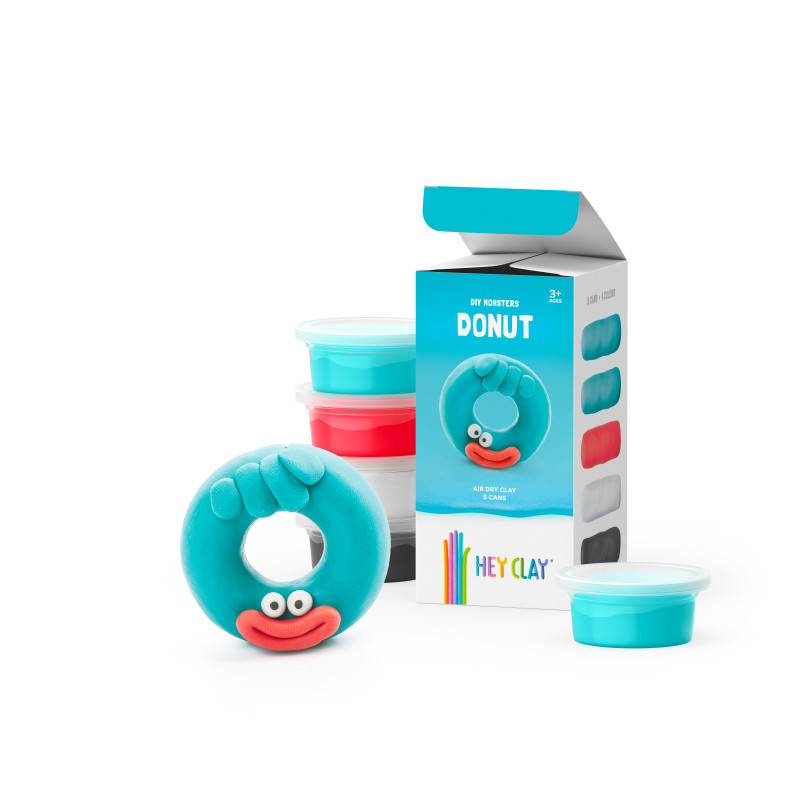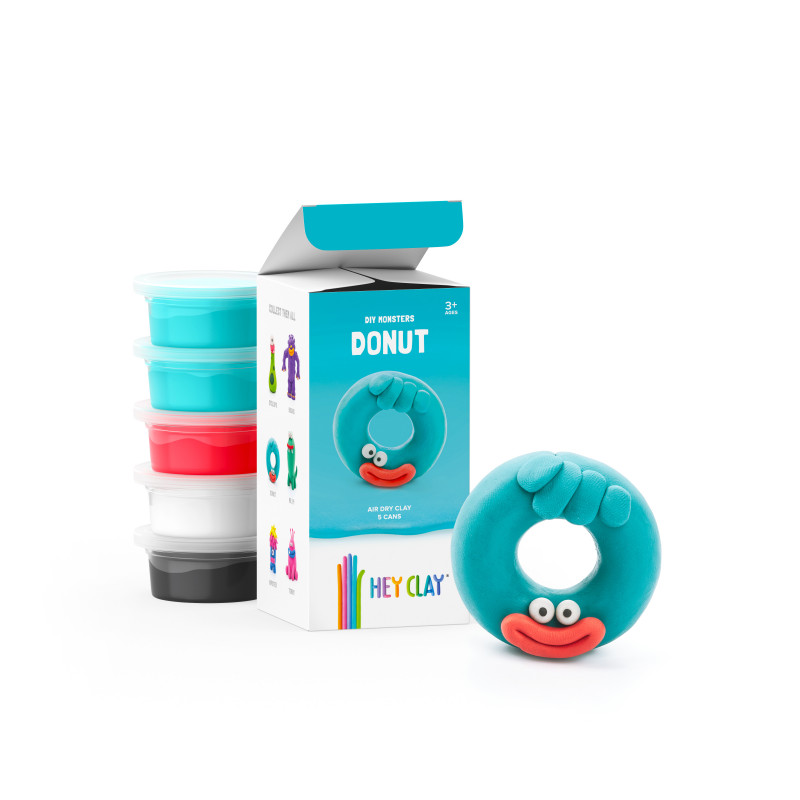 Innehåll: 5 burkar lufttorkande lera (totalt ca 75 g lera i 4 färger) samt ett informationsblad med bilder på monstret, de olika stegen som krävs för att skulptera det, en länk till där ni kan hämta appen och koden som låser upp appens guide för hur man skapar Donut.
