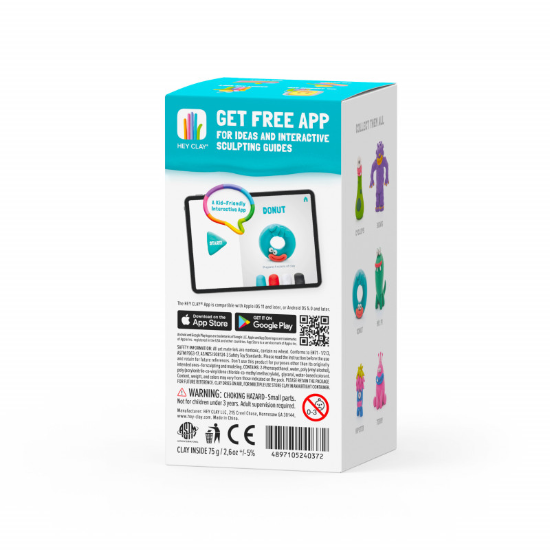 Ett riktigt kul och kreativt set med lufttorkande lera för att skapa det roliga monstret Donut av, som du sen kan leka med eller dela bilder av med dina vänner. Detta set innehåller 5 burkar lätt, mjuk, elastisk och färggrann lera som kan ta form med hjälp av en gratis barnvänlig app med interaktiva video-guider som har enkla steg-för-steg instruktioner (på engelska) för hur man skulpterar olika karaktärer. Du låser upp beskrivningen för Donut med en kod som finns inuti paketet. Låt dig inspireras av appen och skapa roliga karaktärer av den mjuka och färgstarka leran, låt figuren lufttorka i 24 timmar så kan du sen leka med den precis som en leksak eller dela bilder på dina skapelser med dina vänner. Guiden med steg-för-steg instruktionen visar alla grundläggande tekniker för att skulptera i lera och snart kommer barnen längta efter att skapa sina helt egna figurer. Leran är lufttorkande, klibb-fri, giftfri, innehåller inget vete och har klara, livfulla färger som går att blanda ihop. Tvätta händerna efter användning och undvik att leran får kontakt med mun, ögon, mat eller dryck, vatten, fukt samt eld.
