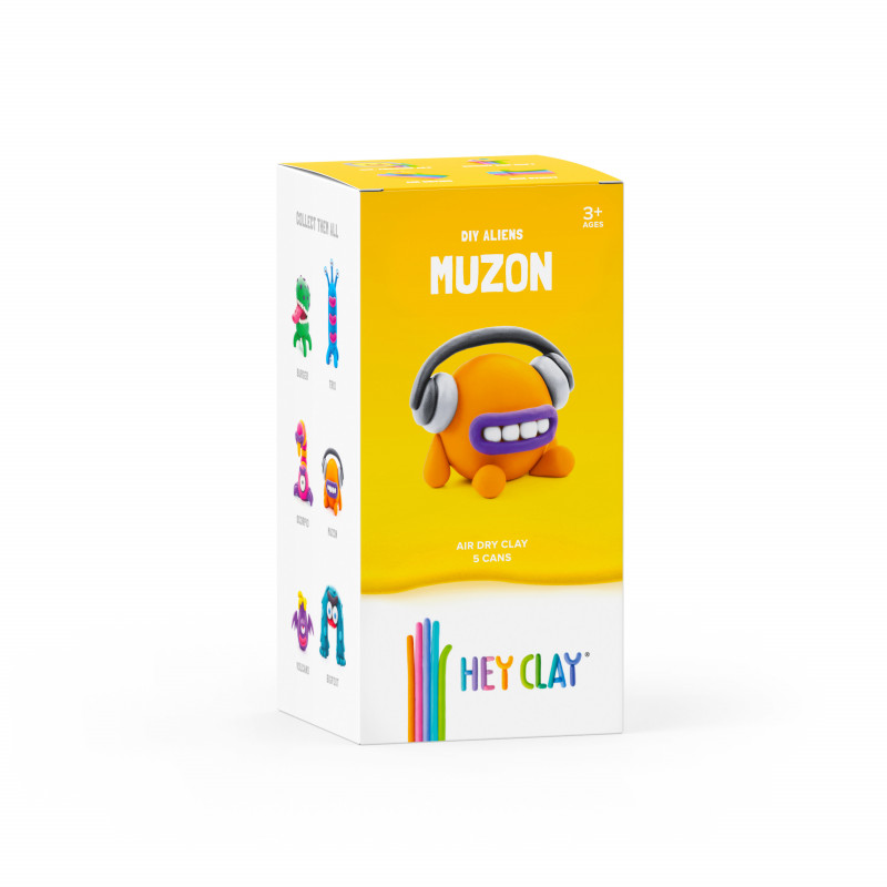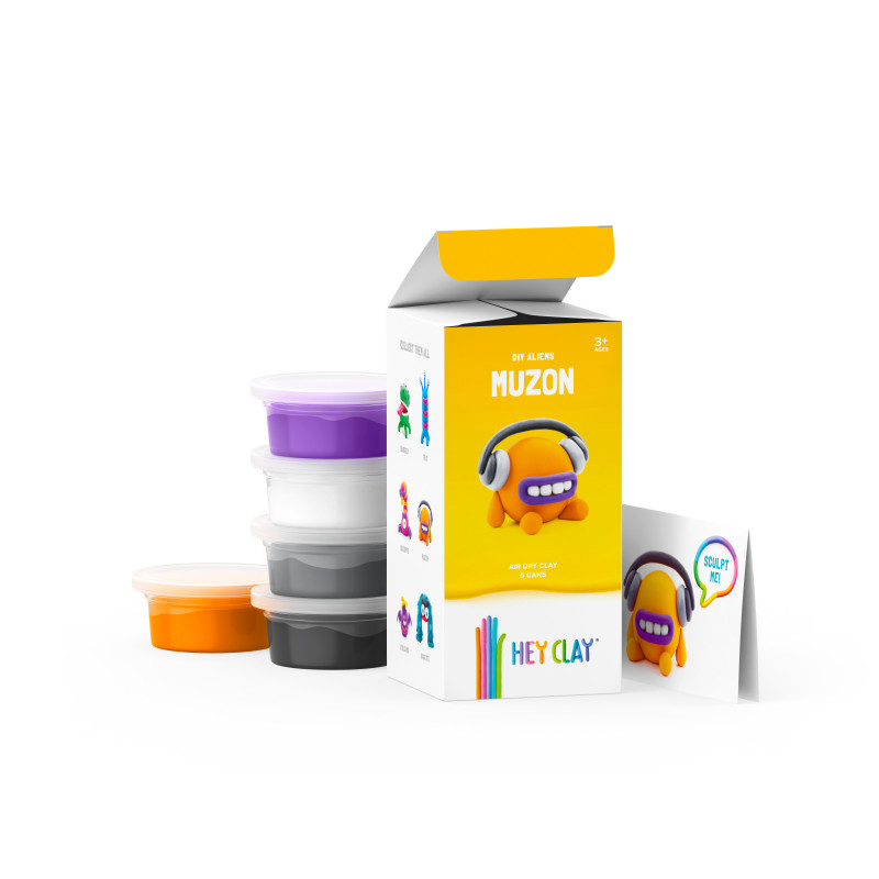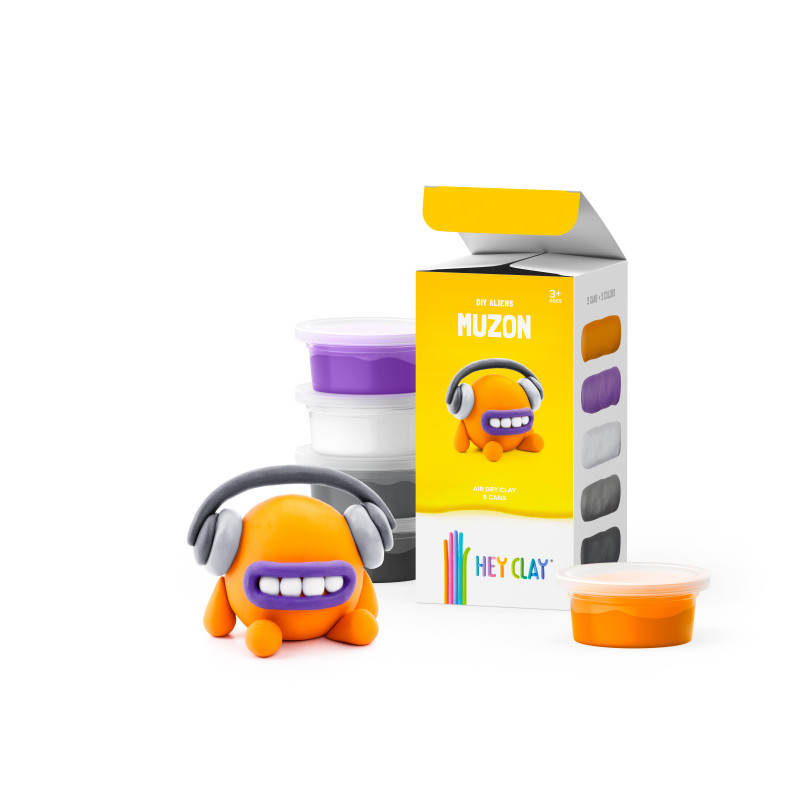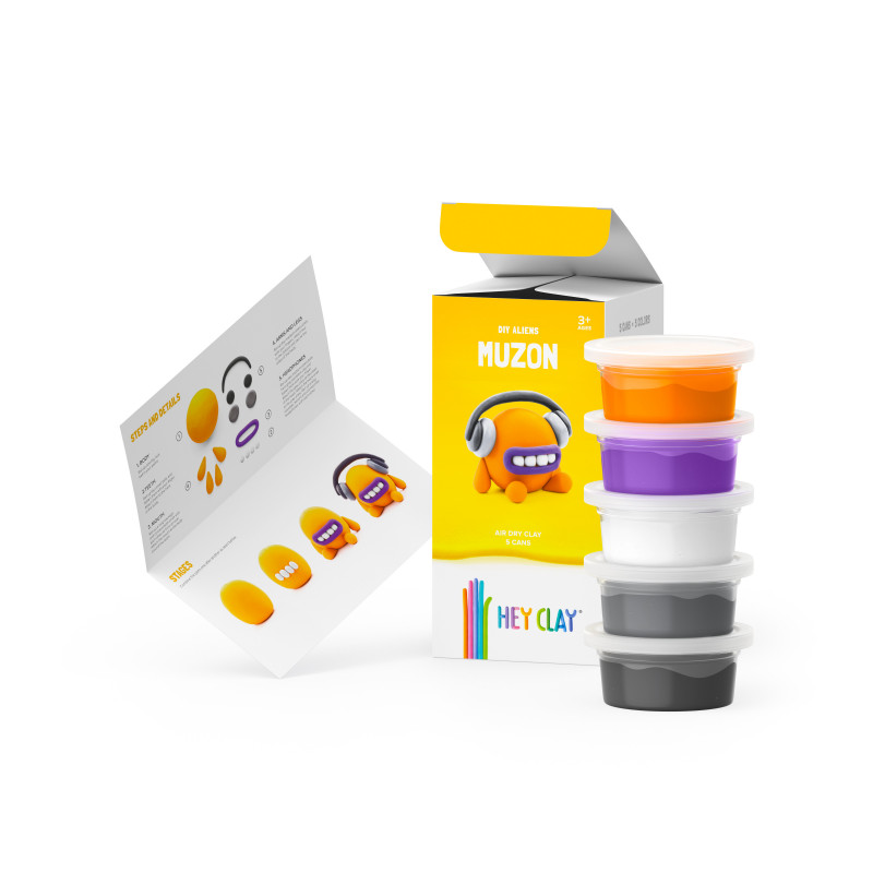 Innehåll: 5 burkar lufttorkande lera (totalt ca 75 g lera i 5 färger) samt ett informationsblad med bilder på utomjordingen, de olika stegen som krävs för att skulptera den, en länk till där ni kan hämta appen och koden som låser upp appens guide för hur man skapar Muzon.