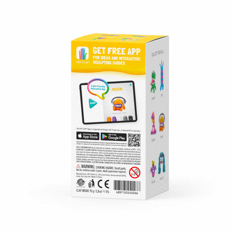 Ett riktigt kul och kreativt set med lufttorkande lera för att skapa den roliga utomjordingen Muzon av, som du sen kan leka med eller dela bilder av med dina vänner. Detta set innehåller 5 burkar lätt, mjuk, elastisk och färggrann lera som kan ta form med hjälp av en gratis barnvänlig app med interaktiva video-guider som har enkla steg-för-steg instruktioner (på engelska) för hur man skulpterar olika karaktärer. Du låser upp beskrivningen för Muzon med en kod som finns inuti paketet. Låt dig inspireras av appen och skapa roliga karaktärer av den mjuka och färgstarka leran, låt figuren lufttorka i 24 timmar så kan du sen leka med den precis som en leksak eller dela bilder på dina skapelser med dina vänner. Guiden med steg-för-steg instruktionen visar alla grundläggande tekniker för att skulptera i lera och snart kommer barnen längta efter att skapa sina helt egna figurer. Leran är lufttorkande, klibb-fri, giftfri, innehåller inget vete och har klara, livfulla färger som går att blanda ihop. Tvätta händerna efter användning och undvik att leran får kontakt med mun, ögon, mat eller dryck, vatten, fukt samt eld.