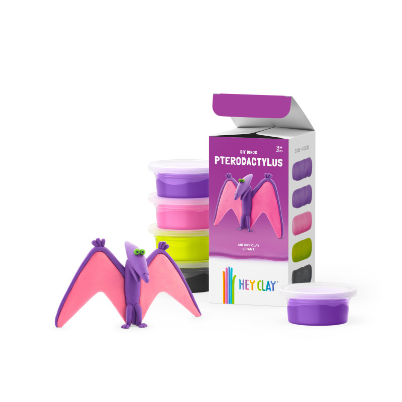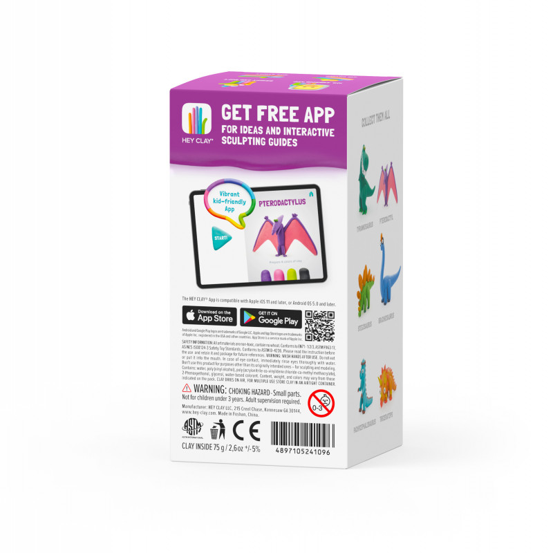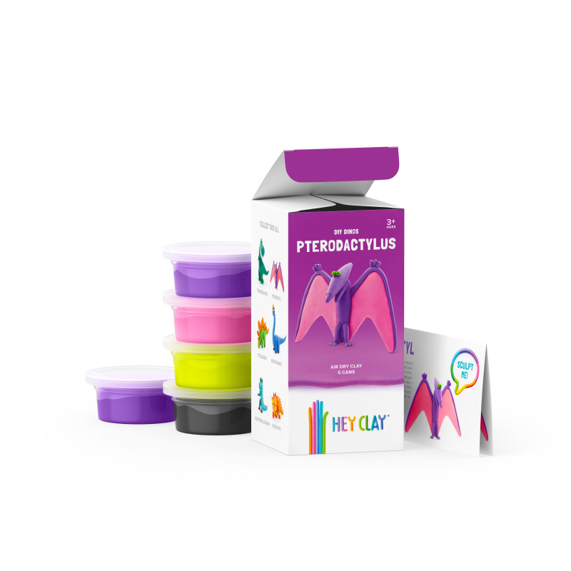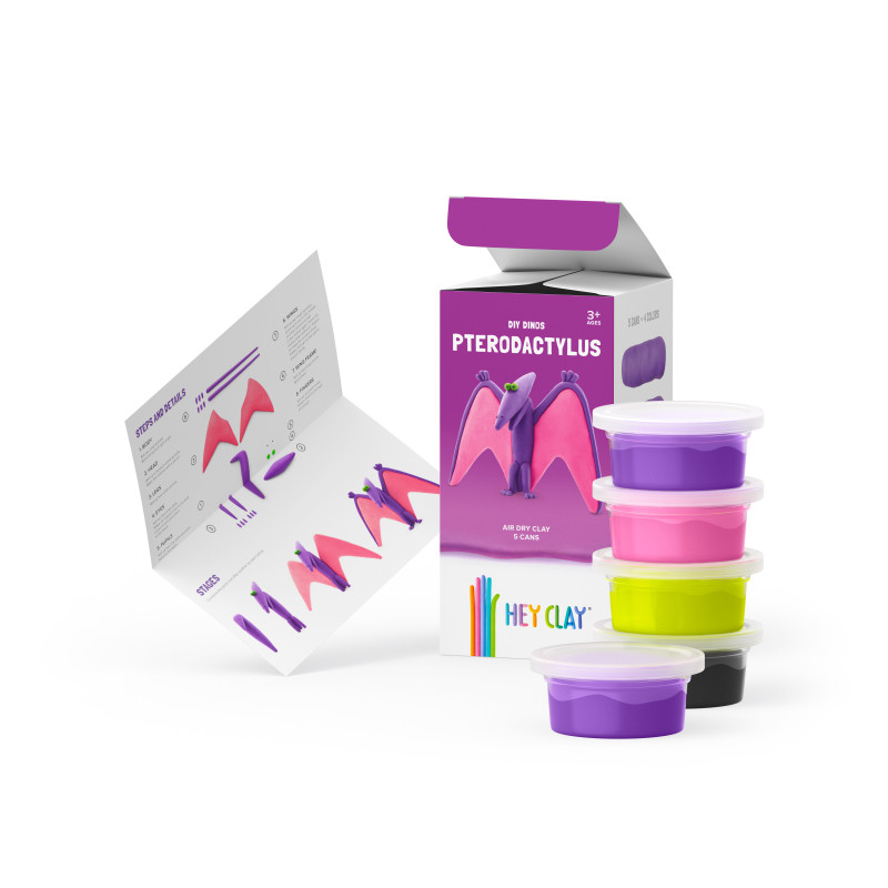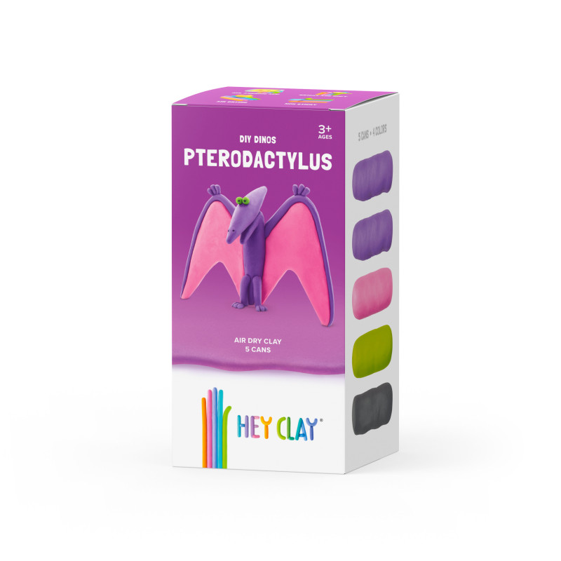Innehåll: 5 burkar lufttorkande lera (totalt ca 75 g lera i 4 färger) samt ett informationsblad med bilder på dinosaurien, de olika stegen som krävs för att skulptera den, en länk till där ni kan hämta appen och koden som låser upp appens guide för hur man skapar flygödlan.