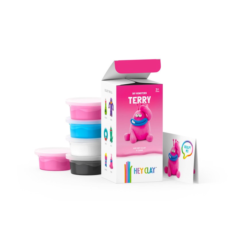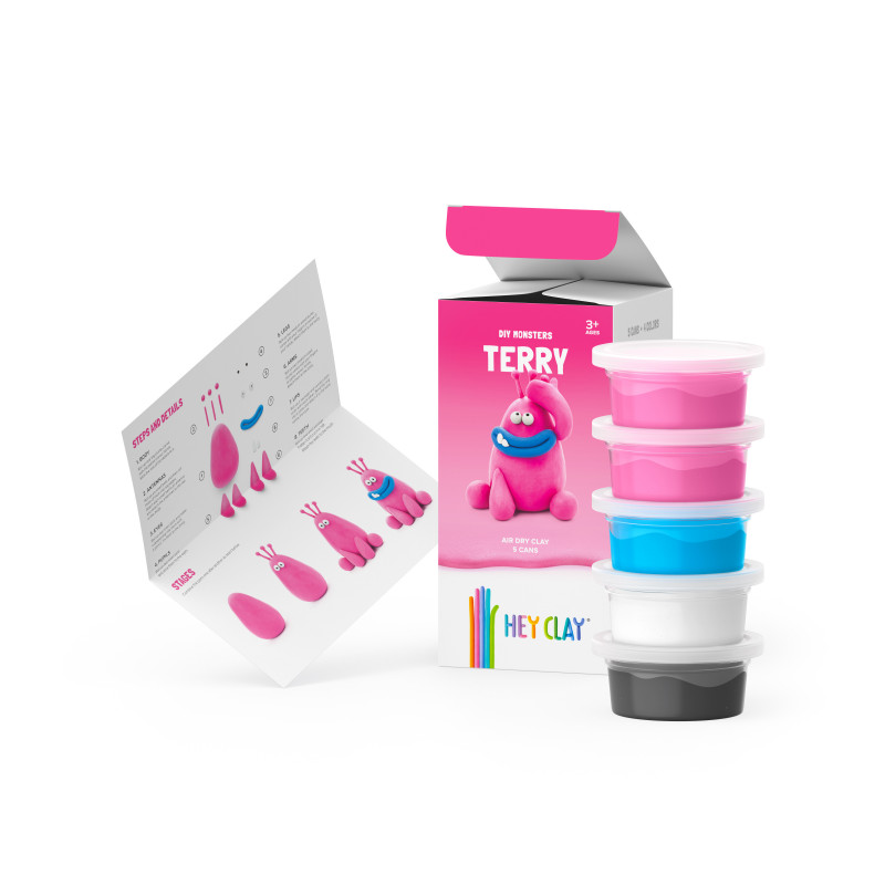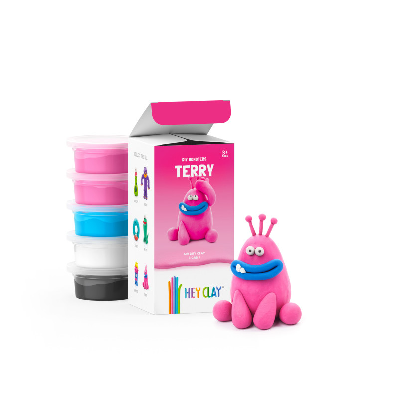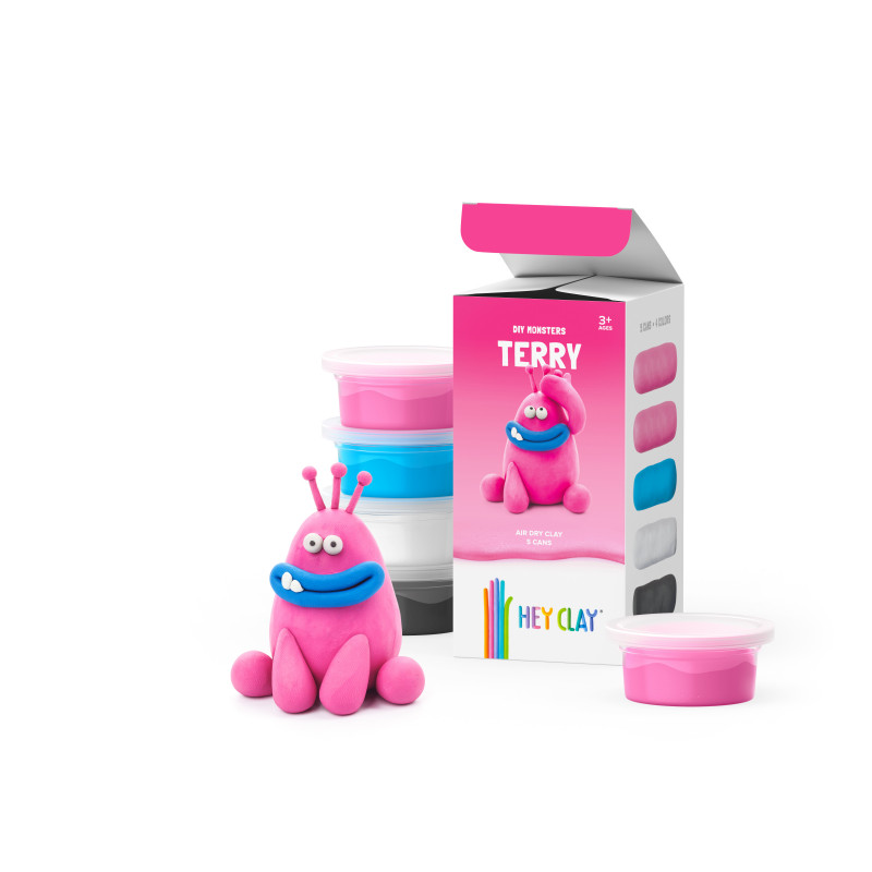 Innehåll: 5 burkar lufttorkande lera (totalt ca 75 g lera i 4 färger) samt ett informationsblad med bilder på monstret, de olika stegen som krävs för att skulptera det, en länk till där ni kan hämta appen och koden som låser upp appens guide för hur man skapar Terry.