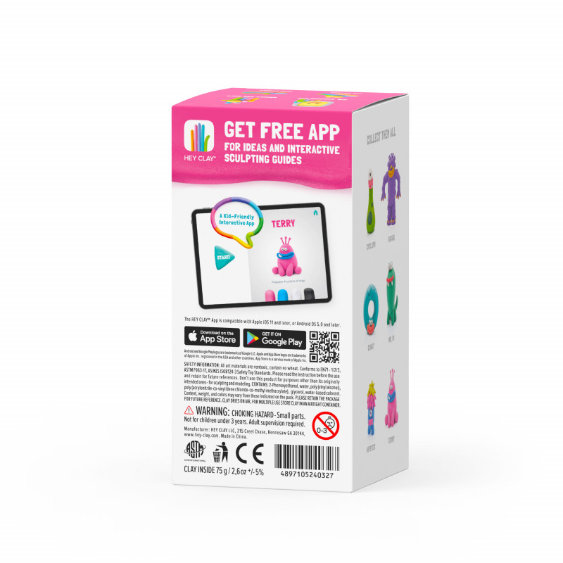 Ett riktigt kul och kreativt set med lufttorkande lera för att skapa det roliga monstret Terry av, som du sen kan leka med eller dela bilder av med dina vänner. Detta set innehåller 5 burkar lätt, mjuk, elastisk och färggrann lera som kan ta form med hjälp av en gratis barnvänlig app med interaktiva video guider som har enkla steg-för-steg instruktioner (på engelska) för hur man skulpterar olika karaktärer. Du låser upp beskrivningen för Terry med en kod som finns inuti paketet. Låt dig inspireras av appen och skapa roliga karaktärer av den mjuka och färgstarka leran, låt figuren lufttorka i 24 timmar så kan du sen leka med den precis som en leksak eller dela bilder på dina skapelser med dina vänner. Guiden med steg-för-steg instruktionen visar alla grundläggande tekniker för att skulptera i lera och snart kommer barnen längta efter att skapa sina helt egna figurer. Leran är lufttorkande, klibb-fri, giftfri, innehåller inget vete och har klara, livfulla färger som går att blanda ihop. Tvätta händerna efter användning och undvik att leran får kontakt med mun, ögon, mat eller dryck, vatten, fukt samt eld.