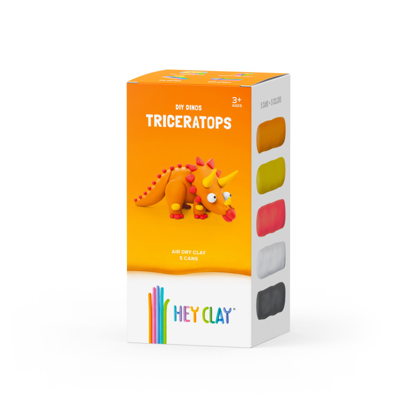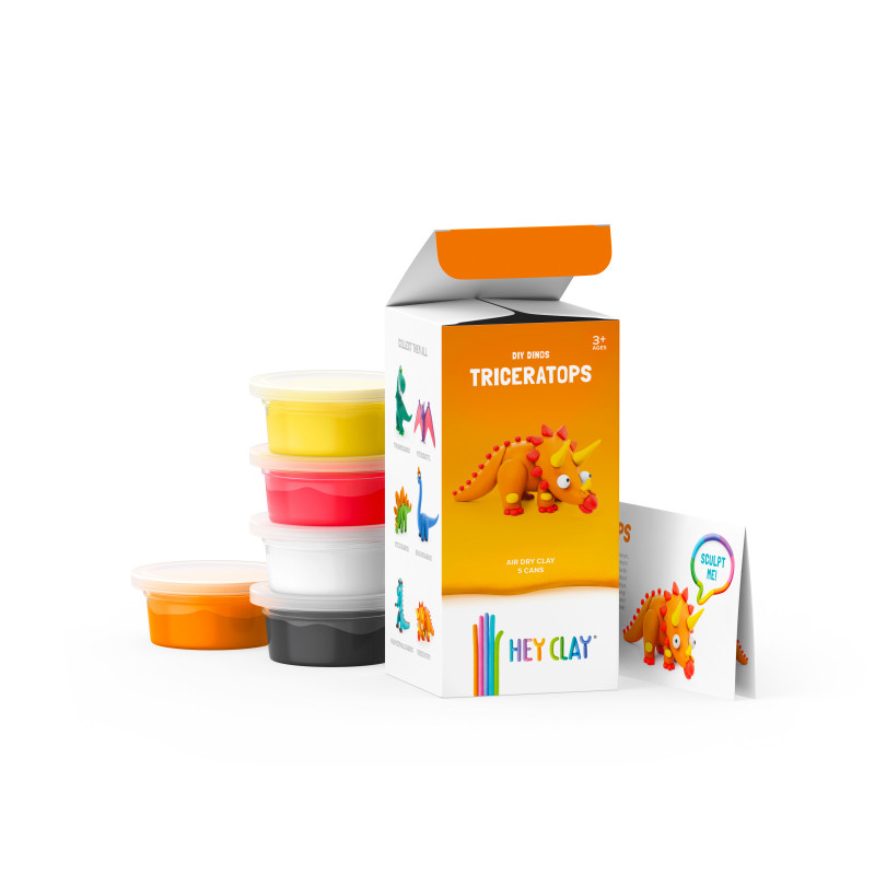 Innehåll: 5 burkar lufttorkande lera (totalt ca 75 g lera i 5 färger) samt ett informationsblad med bilder på dinosaurien, de olika stegen som krävs för att skulptera den, en länk till där ni kan hämta appen och koden som låser upp appens guide för hur man skapar sin triceratops.