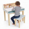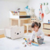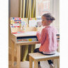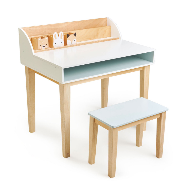Det finaste, lilla skrivbordet med tillhörande pall! Skrivbordet har ett stort fack under bordsskivan för förvaring av papper och böcker. Framtill finns ett långsmalt fack där man enkelt kan ställa ner böcker och annat man vill ha nära till hands. Tre små träaskar medföljer för förvaring av pennor, linjaler, saxar och annat smått och gott. Skrivbordet och pallen har ben i naturfärgat trä och skiva/sits är målade i vitt. Etiskt tillverkat i högkvalitativ plywood och återvunnet gummiträ och målat i mjuka färger. Kräver montering. Bord 75 x 53 x 75.5 cm Pall 45 x 24 x 34.5 cm