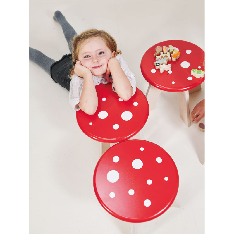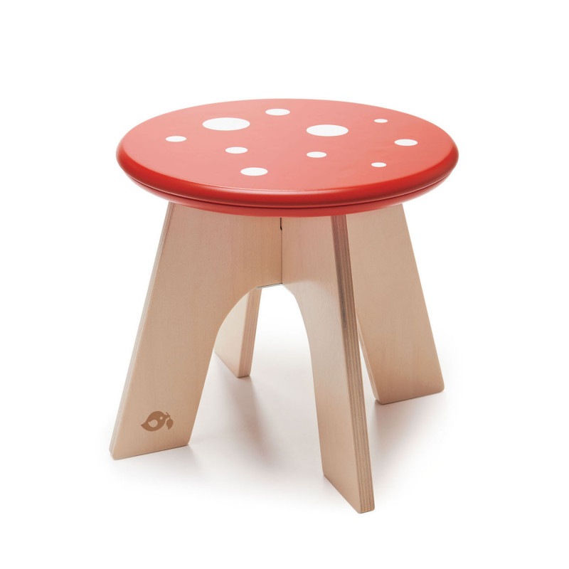 Sötaste lilla pallen till barnrummet i form av en flugsvamp. Stabil och säker att sitta på och enkel att montera. Pallen har ben i naturligt trä och sitsen är målad som en flugsvamp. Kan också tjänstgöra som ett litet bord. Etiskt tillverkat i högkvalitativ plywood och återvunnet gummiträ. Kräver montering. 34.5 x 34.5 x 28 cm