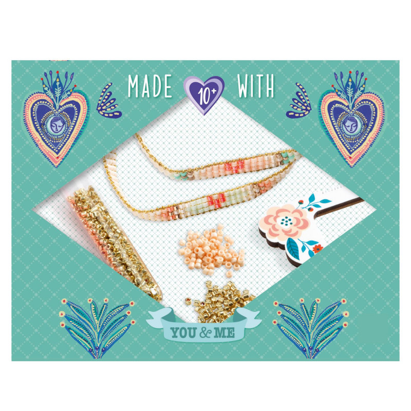 En vacker liten låda som innehåller ett snyggt urval av pärlor och berlocker för att skapa två vackra kärleks- eller vänskapsarmband. Paketet innehåller allt material som behövs för att skapa två speciella armband med hjärtan i en pärlväv, smycken som du kan behålla eller ge bort till någon du håller kär i en liten påse av organza. Det medföljer också två dubbla kort med olika motiv som passar armbanden där du eller ni kan skriva små meddelanden eller kärleksanteckningar. Pärlorna och berlockerna är speciellt utvalda för att ge ett fantastiskt resultat varje gång, det medföljande häftet ger noggranna instruktioner med hjälp av färgbilder och du kan avnjuta aktiviteten antingen själv eller tillsammans. Innehåll: 4 rör med små pärlor, 8 m guldig tråd, 2 nålar, 2 organza påsar, 2 dubbla kort, 1 häfte med inspiration och steg-för-steg instruktioner. Från +10 år.