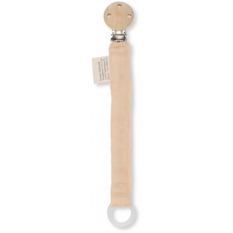 Den här praktiska napphållaren från Konges slöjd gör att du inte behöver leta efter barnets napp, dessutom riskerar inte nappen att ramla ner på marken och bli smutsig. Fäst nappen med ett metallclips på tröjan, den lilla ringen passar dom flesta napparna. Storlek: 22 cm Material: 100% ekologisk bomull