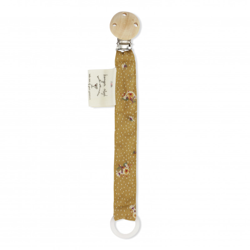 En praktisk napphållare från Konges slöjd som gör att du inte behöver leta efter barnets napp, dessutom riskerar inte nappen att ramla ner på marken och bli smutsig. Fäst nappen med ett metallclips på tröjan, den lilla ringen passar dom flesta napparna. Storlek: 22 cm Material: 100% ekologisk bomull
