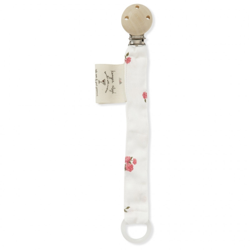 Den här praktiska napphållaren från Konges slöjd gör att du inte behöver leta efter barnets napp, dessutom riskerar inte nappen att ramla ner på marken och bli smutsig. Fäst nappen med ett metallclips på tröjan, den lilla ringen passar dom flesta napparna. Storlek: 22 cm Material: 100% ekologisk bomull