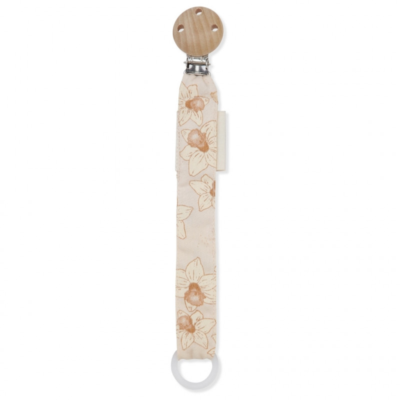 Den här praktiska napphållaren från Konges slöjd gör att du inte behöver leta efter barnets napp, dessutom riskerar inte nappen att ramla ner på marken och bli smutsig. Fäst nappen med ett metallclips på tröjan, den lilla ringen passar dom flesta napparna. Storlek: 22 cm Material: 100% ekologisk bomull