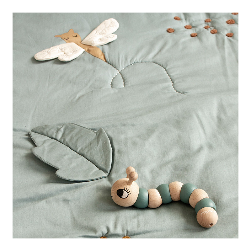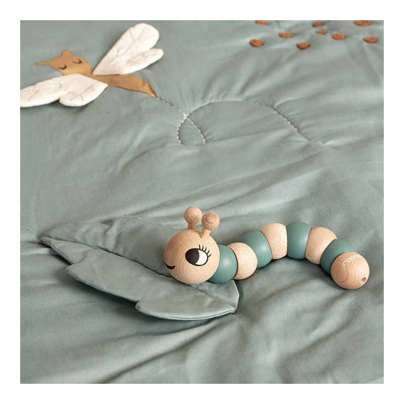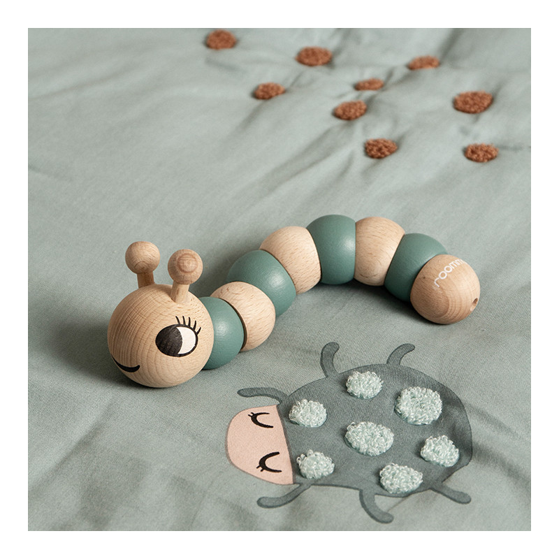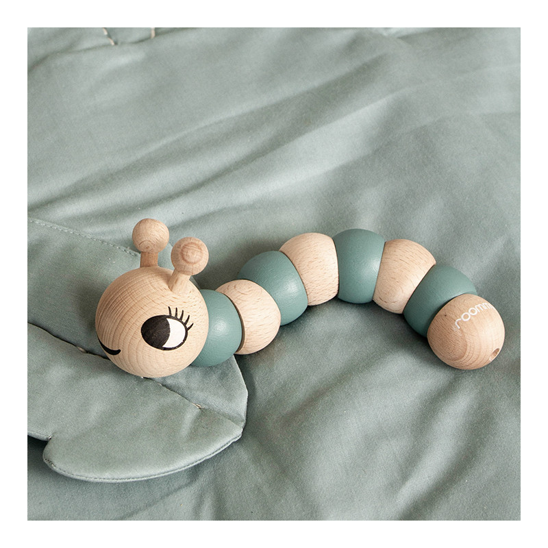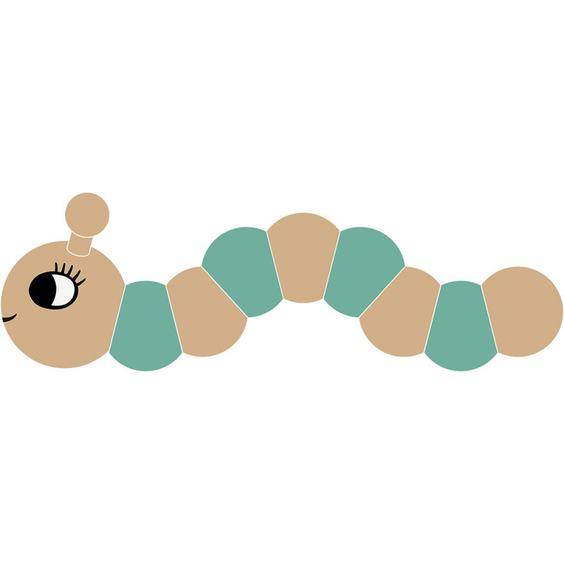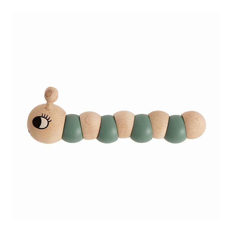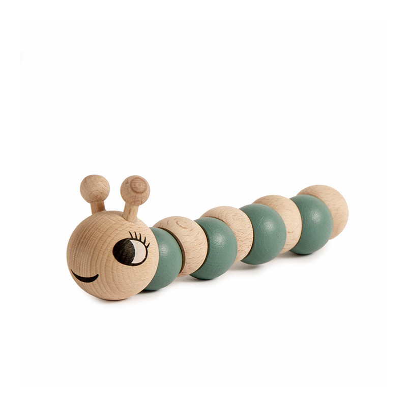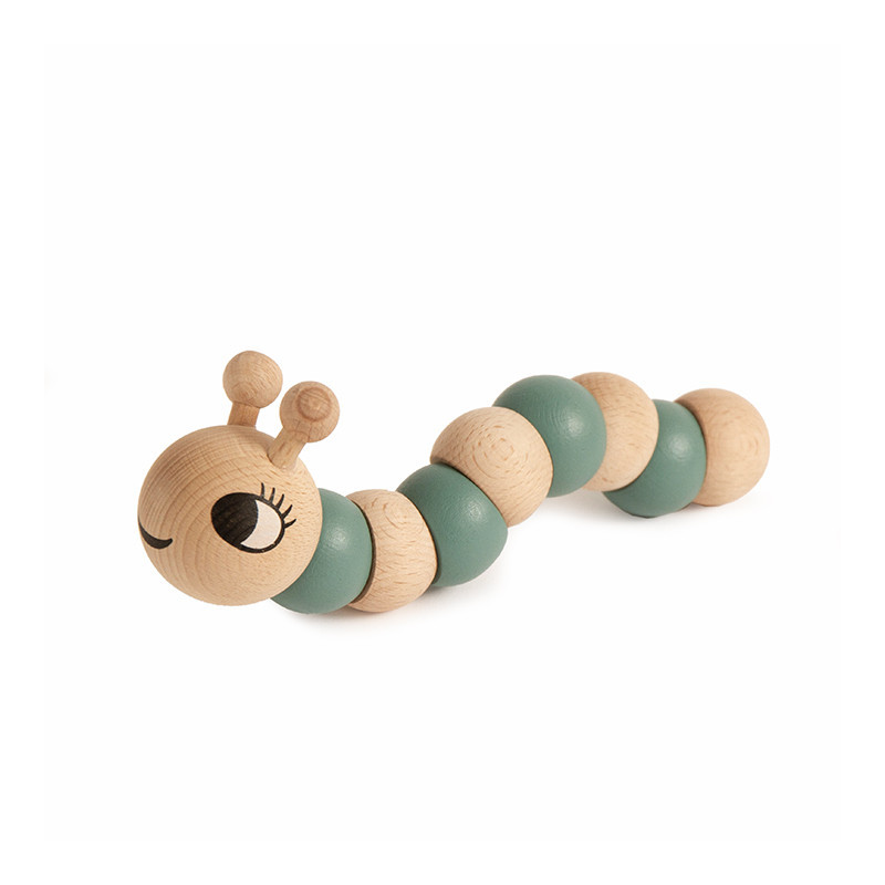 En rolig träleksak med små antenner och en segmenterad kropp som går att vrida till olika ställningar. Den söta larven eller masken har vartannat segment av kroppen målat i en snygg sjögrön nyans och vartannat segment samt huvudet i den naturliga nyansen av bokträ. Torkas av med en fuktig trasa vid behov.
