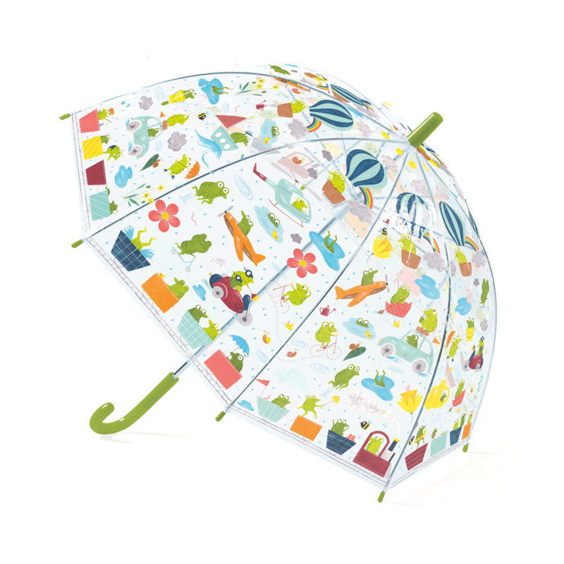 Ett snyggt barnparaply i semitransparant plast med en massa kul och färgglada bilder på grodor i alla möjliiga situationer. Med ram i glasfiber, ett böjt grönt handtag och ett säkerhetssystem för att undvika klämskador. Eftersom paraplyet är ganska genomskinligt ser man barnet bättre och barnet ser vuxnas ansikten, skyltar och annat viktigt. Från 3 år. Storlek utfälld: 70 Ø x 68 cm.