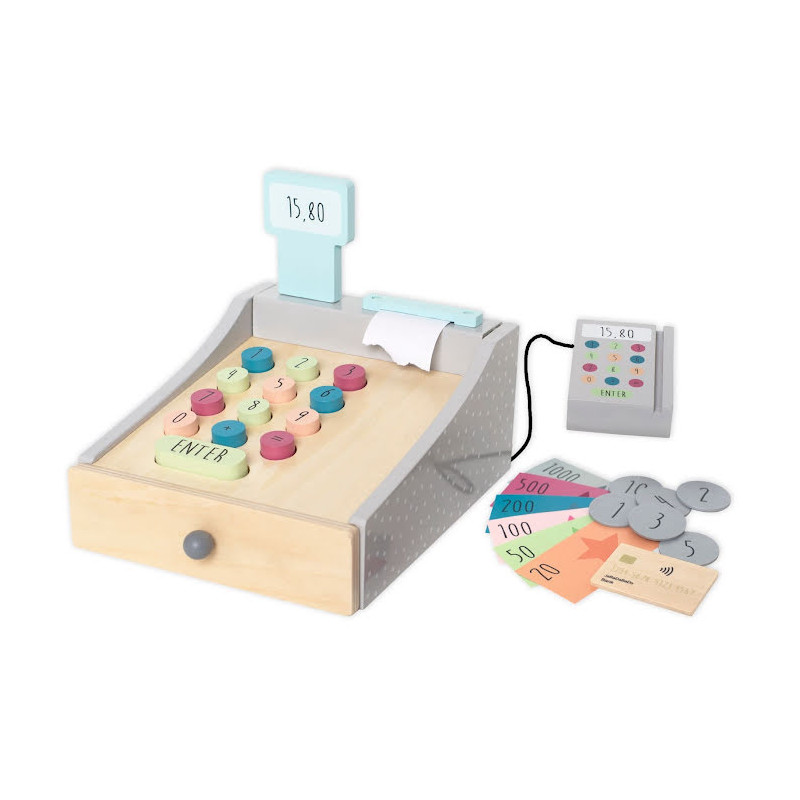 Äntligen kan du slå upp portarna till din alldeles egna lilla affär och låta vänner och familj shoppa loss! Leken blir ännu roligare med denna spännande och pedagogiska kassaapparat. Innehåller sedlar respektive mynt i 3 olika valörer.