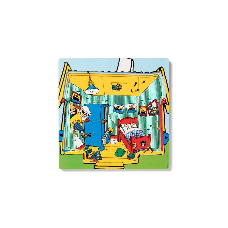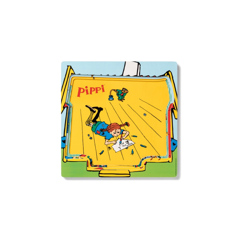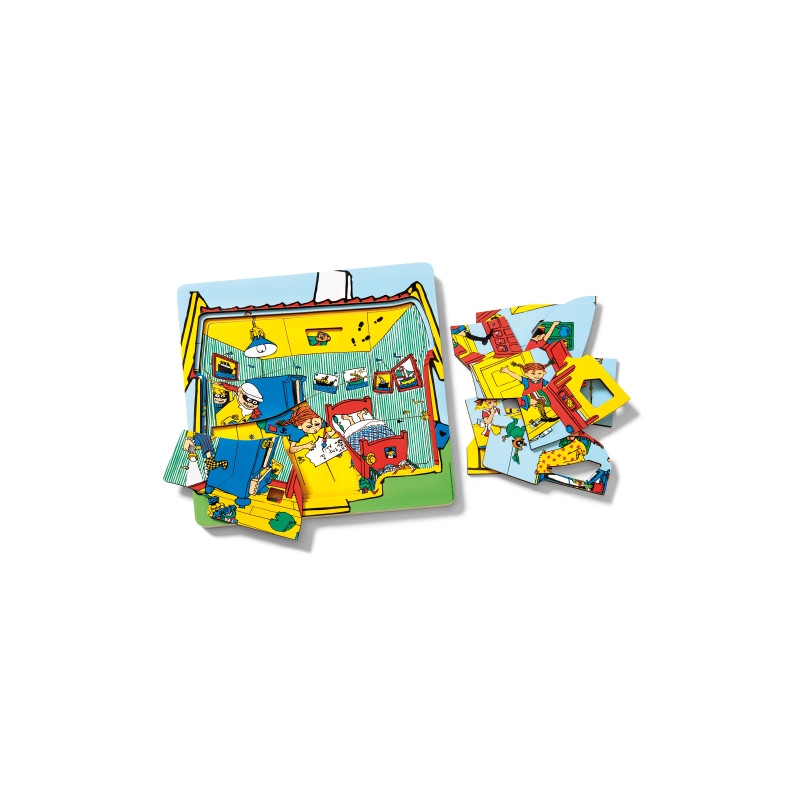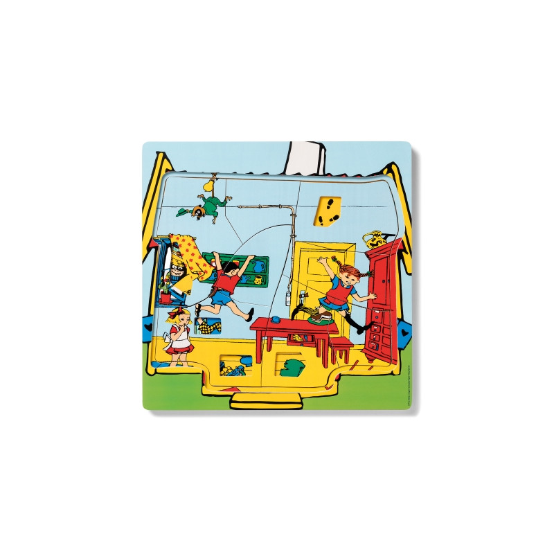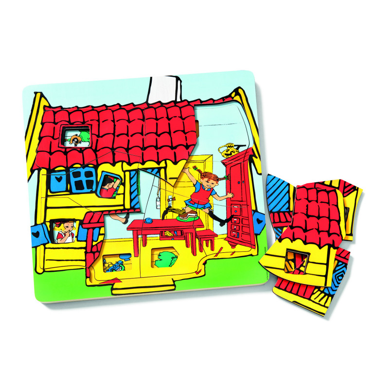 Pippipussel i trä med 24 pusselbitar uppdelade i 3 lager. För varje lager du pusslar, upptäcker man mer av vad som är på gång i Pippi Långstrumps hus Villa Villekulla. Vilka är där och vad håller de på med?