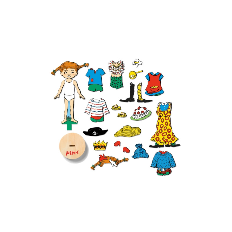 Den här Pippidockan i trä kommer med 20 magneter i form av klädesplagg och roliga tillbehör att klä Pippi med, precis som en klassisk klippdocka. Vad ska Pippi ha på sig idag? En tårta som hatt, vantar på söderhavsön eller ägg i håret vid plättbaket? När Pippi är med kan det bli precis hur tokigt som helst!