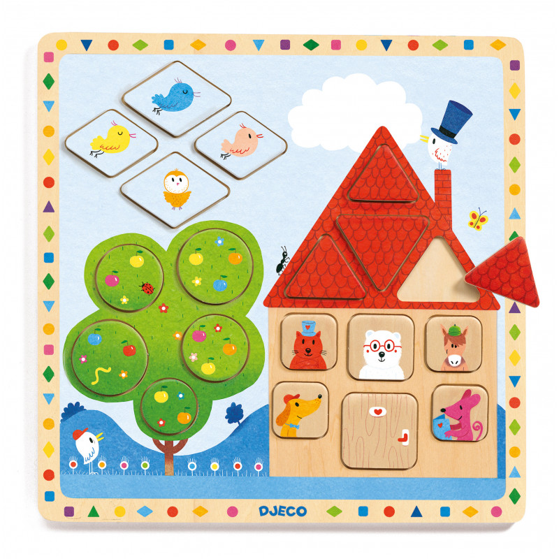 Fint pussel i trä som tränar både finmotorik och barnets uppfattning om storlek och form. Med fyra olika geometriska former och charmigt motiv på ett hus och trädgård. Pusslet innehåller 19 bitar + motivplatta. Storlek: 30 x 30 x 1 cm Från 3 år. Storlek: 30 x 30 x 1 cm