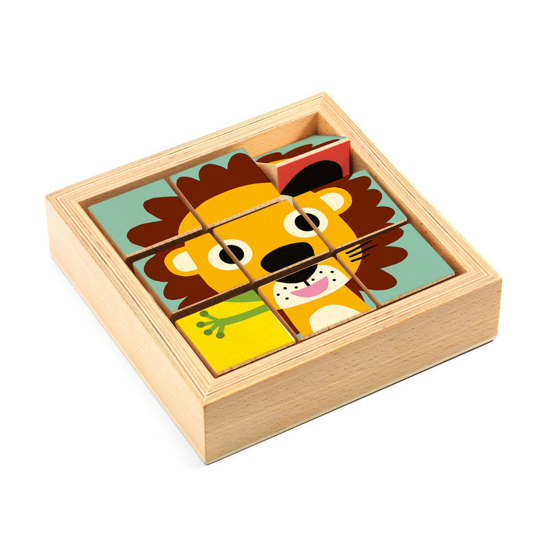 Härligt pussel i trälåda där bitarna är trekantiga och fästa på stång inne i lådan vilket gör dem snurrbara. I lådan kan du bygga tre olika pussel och varje pussel innehåller 9 bitar. Motivet är fina djur - Ett lejon, en groda och en panda. Tillverkad i trä och plast. Storlek: 13 x 13 x 3,5 cm. Från +2 år.