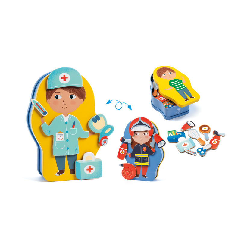 En rolig formad metallåda som innehåller trämagneter med tema yrken. På ena sidan av boxen finns en tjej och den andra sidan finns en kille som båda kan utrustas med kläder, tillbehör och verktyg för olika yrken, till exempel lärare, brandman, doktor, kock och många fler! Hitta de magneter som hör till ett visst yrke eller mixa dem som du vill och hitta på nya jobb eller yrken. När leken är över kan magneterna förvaras inne i lådan vilket också är perfekt vid resor. Innehåller 20 trämagneter av hög kvalitet och en låda i metall. Boxen är 14 x 20,4 x 5,5 cm stor. Från 3 år.