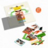 Ett kul set där du får sätta ihop magnetiska delar på den rutiga skivan för att skapa roliga monster som sedan kan komma till liv och se ut att röra sig med hjälp av det speciella randiga arket. Delarna kan sättas ihop på tusentals olika sätt, så det är bara att prova sig fram till det roligaste, knäppaste, sötaste eller mest galna monstret. För att göra aktiviteten ännu roligare så får de två randiga optiska arken dem alla att animeras på nästan magiska och oväntade sätt med hjälp av optiska synvillor när man drar dem över monstret. Den rutiga skivan gör det enkelt att positionera delarna du vill ha rätt i förhållande till varandra och instruktions häftet med steg-för-steg beskrivningar ger inspiration och några exempel på hur man ska göra för att få ett bra resultat. De många delarna möjliggör många timmar av kreativ lek som också kräver lite logiskt tänkande. Tillverkat med FSC®️ certifierad kartong och papper. Innehåll: 1 magnetisk skiva (21,5 x 21,5 cm), 2 ark av randig plast (15,5 x 15,5 cm och 12 x 12 cm), 27 magnetiska monster delar, 1 häfte med inspiration och steg-för-steg instruktioner i färgbilder, 1 förvaringsask. Från +5 till 8 år.