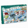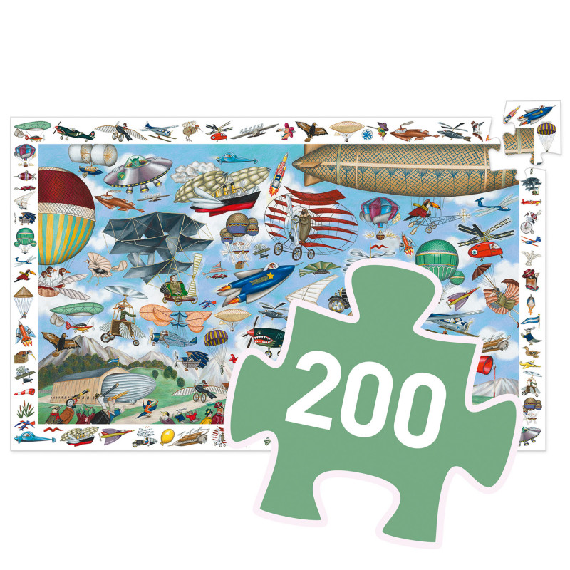 Underbart pussel med rikt detaljerade illustrationer av allsköns flygande farkoster med en hel del överraskningar. Du får med en poster i naturlig storlek av pusslet som du kan använda som referens (eller som fusklapp att lägga under pusslet). Här ser du både zeppelinare, flygplan, flygande tefat och andra spännande konstruktioner som flyger. Runt ramen på pusslet finns det detaljer ur den stora bilden - kan du hitta var alla detaljerna finns? Pusslet är av hög kvalitet, är tillverkat i Europa av FSC®️ MIX certifierad papp och består av 200 bitar. Storlek på det färdiga pusslet: 61 x 38 cm. Från 6 år.