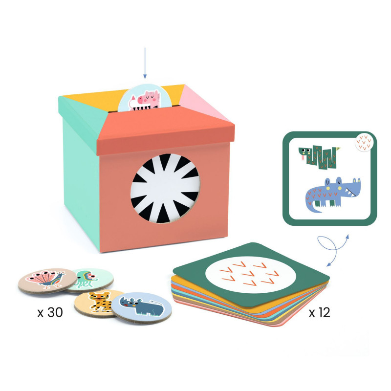 Ett kul och pedagogiskt spel om observation och sortering där barnet ska använda ett kännetecken för att gruppera olika djur. Vilka djur har en nos med morrhår? Eller ett fjälligt mönster? Ett kort i taget sätts på plats bakom den runda öppningen i lådan så att den kännetecknet syns genom hålet och sedan ska barnet leta efter de polletter som uppfyller kriteriet. De polletter som ser ut att stämma stoppas i lådans springa, som i en sparbössa, och när barnet tycker att hen är klar tas polletterna ut ur lådan ut så att ni kan kontrollera om det är rätt. Korten med kriterier har bilder av de motsvarande djuren på sin baksida, så ni kan dra ut kortet från lådan och kolla svaret mot bilderna. En kul introduktion till grunderna för sortering, organisering och att städa upp/ställa iordning. Spelets delar är tjocka samt enkla att hantera och den snygga lådan är kul att leka med som en sparbössa. Ett kul sätt att hjälpa barnet utveckla sin observationsförmåga. Detta spel finns också i motsvarande versioner med leksaker (geometriska former, artikel DJ08145) och hushåll (gruppera saker och möbler, artikel DJ08146). Tillverkad av FSC® certifierad kartong. Innehåll: 12 dubbelsidiga kriteriekort (svaret på baksidan), 30 stora polletter med bilder på djur, 1 låda med lock som har öppning för polletterna, spelregler och instruktioner på tio språk inklusive svenska. Från +3 till 6 år. För 1 barn (och en vuxen).