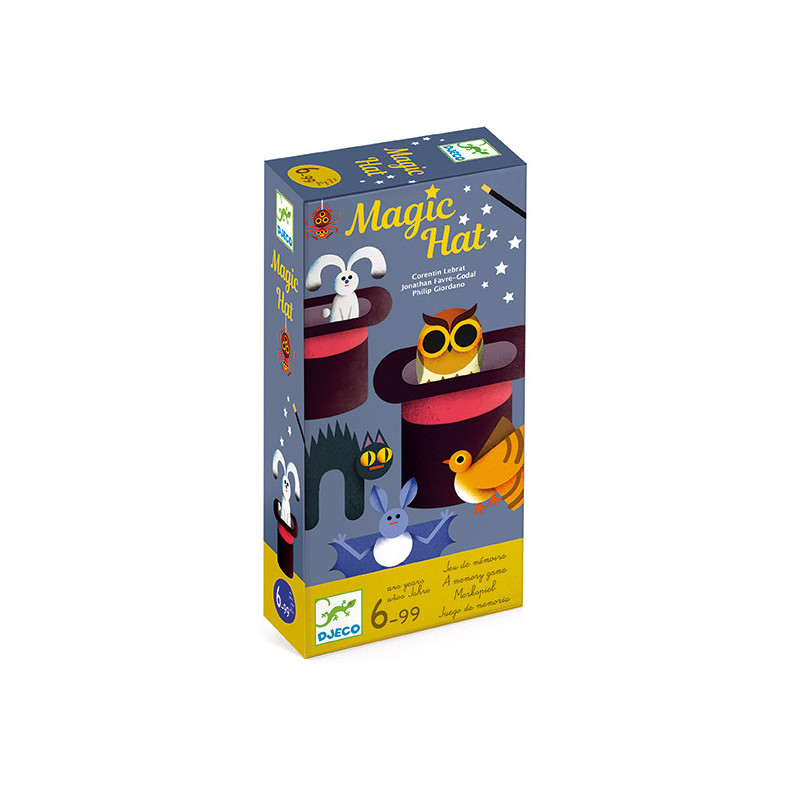 Ett lite annorlunda minnesspel där du ska försöka lista ut vilket av de sex djuren som trollkarlen har trollat bort. Spelet spelas med 6 höga trollkarlshattar som döljer varsin bild på ett av djuren. Hattarna blandas och en slumpvis hatt läggs undan i asken utan att någon får se bilden inuti hatten - denna hatt är nu borttrollad. Sedan får en spelare i taget välja att antingen titta på bilden i en av de kvarvarande hattarna utan att visa de andra ELLER säga vilket djur hen tror är borttrollat. När en spelare har tittat i en hatt ska hen sedan sätta tillbaka hatten på bordet och byta plats på den och en av de andra hattarna medan de andra ser på. Kan du hålla reda på vilka av hattarna du har kollat på? Det är inte så lätt som det kan verka. Om en spelare väljer att säga vilket djur hen tror har trollats bort så får denna spelare kolla i den borttrollade hatten utan att visa de andra, och om gissningen var rätt så vinner hen omgången och en pollett med en trollkarlshatt. Om gissningen var fel så får spelaren som gissade inte vara med på resten av omgången och får inte berätta vilket djur som hade trollats bort. Den spelare som har vunnit två omgångar får polletten med trollstaven och har då vunnit hela spelet. Det finns också en variant på spelet för dem som tycker att de är experter - när en spelare har tittat i en av hattarna och bytt plats på denna och en annan hatt får hen dessutom välja att byta plats på ytterligare två valfria hattar. Innehåll: 6 trollkarls-hattar i plast (med en bild inuti på varsitt djur), 6 fyrkantiga djurkort, 4 runda polletter med en bild på en trollkarlshatt, 1 rund polett med bild på en trollstav samt ett häfte med spelregler på 10 språk. Speltid: ungefär 10 minuter. Från 6 till 99 år. För 2-4 spelare.