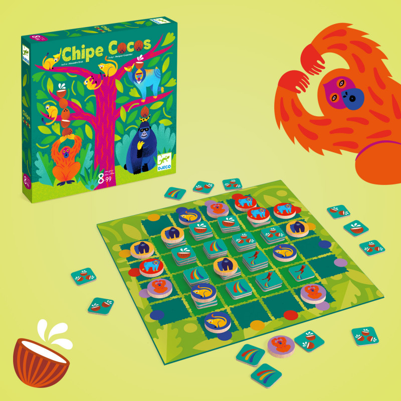 Ett kul strategispel där olika gäng med apor kämpar om att bli det gäng som genom bra organisering lyckats skörda flest kokosnötter samtidigt som de driver ut rivaliserande apor, och allt detta innan tigern kommer. Välj spelplan beroende på om ni är två eller fler spelare, välj vilket gäng med apor du vill spela, blanda spelbrickorna med framsidan nedåt, samla brickorna till 16 högar med 3 brickor var och placera högarna med framsidorna upp på alla de ljusgröna rutorna i mitten av spelplanen och placera aporna på de mörkgröna startrutorna enligt färgmarkeringarna. Sedan går spelet ut på att flytta en apa i taget ett steg vågrätt eller lodrätt medan du planerar och anpassar din strategi så att du i slutet får flest poäng från kokosnötter och de rivaliserande apor du tagit genom att hoppa över dem. När en apa hamnar på en kokosnöts-bricka tar spelaren denna och lämnar spelpjäsen på denna plats, men om apan hamnar på en hoppbricka får spelaren flytta ytterligare ett steg och tar både hoppbrickan och eventuell kokosnöts-bricka du landar på. Om någon landar på en hopp + tiger bricka lägger hen denna synlig bredvid spelplanen och tigern smyger ett steg närmare. Om alla spelarna tillsammans råkar plocka alla fyra tigerbrickorna så kommer tigern fram och spelet är över, men annars fortsätter spelet tills någon av spelarna har förlorat alla sina apor. När spelet är slut tar ni bort alla apor som fortfarande befinner sig i startområdet och räknar 1 poäng för varje kokosnöt på de spelbrickor du tagit, samt 5 poäng för varje rivaliserade apor du fångat. Den spelare som har fått flest poäng vinner spelet. Tillverkat av FSC®️ certifierad kartong och papper. Innehåll: 1 dubbelsidig spelplan (framsida för 3 eller 4 spelare, baksidan för 2 spelare), 24 apor (8 blå, 8 gula, 4 röda, 4 lila), 48 spelbrickor (30 brickor med antingen en, två eller tre kokosnötter, 14 hoppbrickor, 4 hopp- och tigerbrickor), spelregler på tio språk inklusive svenska. Speltid: ungefär 20 minuter. Från +8 till 99 år. För 2-4 spelare.