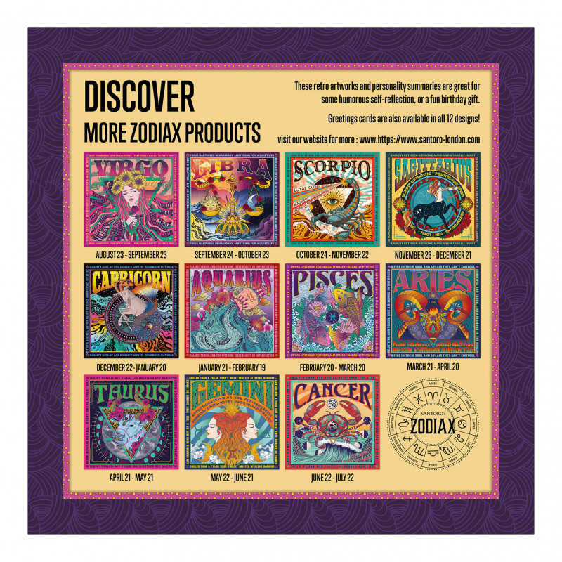 Med en djärv färgpalett och slående grafik som skiljer sig från andra pussel på marknaden, har varje individuellt stjärntecken en unik konst inspirerad av 1970-talets skivomslag i ljusa, psykedeliska färger. Komplett med (ibland dolda) roliga personlighetsattribut, kommer konsten att få dig att skratta när du bit för bit avslöjar hela designen.