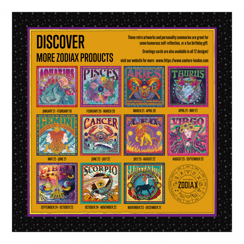 Med en djärv färgpalett och slående grafik som skiljer sig från andra pussel på marknaden, har varje individuellt stjärntecken en unik konst inspirerad av 1970-talets skivomslag i ljusa, psykedeliska färger. Komplett med (ibland dolda) roliga personlighetsattribut, kommer konsten att få dig att skratta när du bit för bit avslöjar hela designen.