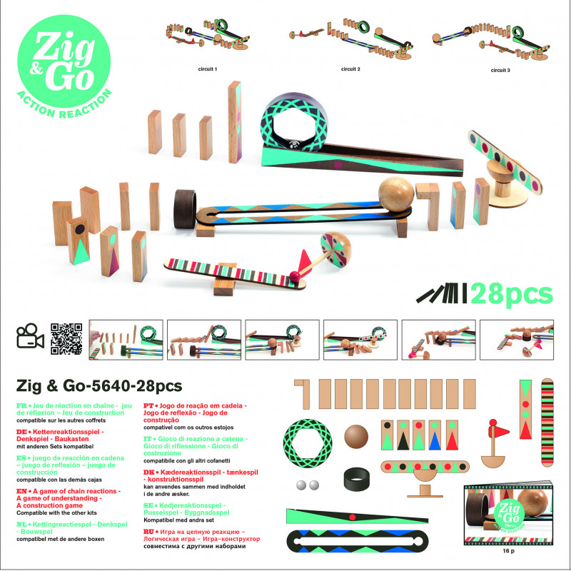 Ett roligt och spännande set med 28 delar där man bygger ihop hinderbanor och lär sig förstå kedjereaktioner och hur de samverkar. Sätt ihop en bana utifrån en av de tre designerna i instruktionshäftet eller kom på en egen och följ sen hur rörelseenergin rör sig genom banan och välter/vrider/sätter delar i rullning till följd av tidigare reaktioner. Lyckas du bygga en bana där rörelseenergin tar sig igenom hela banan på första försöket? - det är inte lätt! För att lyckas måste du tänka på hur snabbt olika delar kommer röra sig (beroende på vikten) och avgöra hur nära och i vilken vinkel du ska sätta nästa del. Banan kan byggas upp på mängder av olika sätt och kan sättas ihop med alla andra delar i Zig & Go serien till riktigt episka banor. Upptäck, experimentera och testa på nytt! Setet är tillverkat av trä och innehåller två metallkulor. Innehåller 28 delar och en 16-sidig instruktionsbok med bilder. Det fins en officiell video upplagd på YouTube som du kommer till med hjälp av en QR-kod på paketet. Från 7 till 99 år.