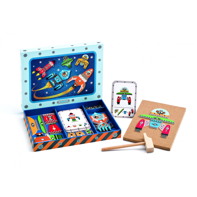 Ett klassiskt nöje som övar upp fingerfärdighet och precision med hjälp av en tjock korkskiva, en hammare i trä, spikar med stora huvuden och motivplattor i trä med hål för spikarna. Allt material är samlat i en praktiskt indelad låda av trä. Spika upp plattorna efter någon av ritningarna som medföljer eller använd dig av din fantasi och skapa dina egna motiv. Temat i denna box är olika häftiga rymdskepp. Timmar av kul! Från 4 år.