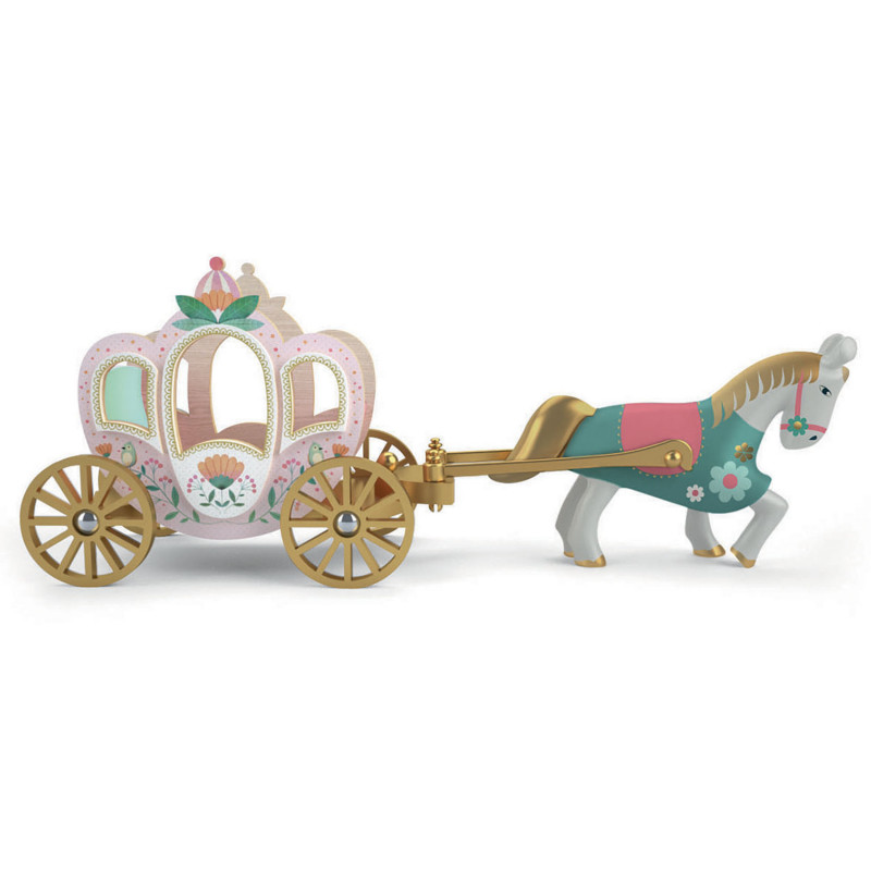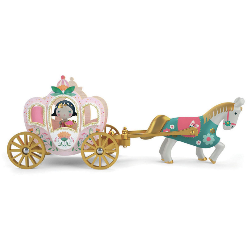 En vacker, elegant och uppseendeväckande hästdragen vagn för Arty Toys prinsessan Mila. Den vackra ljusrosa vagnen har ett öppet tak så att du lätt kan se och leka med prinsessan inuti och är snyggt dekorerad med blommor, gyllene spetsmönster runt fönstren samt guldfärgade hjul och skaklar. Den snygga vita hästen har gyllene man, svans och hovar och ett elegant turkost täcke dekorerat med blommor. Mila har ganska kort svart hår och en vackert böljande klänning i rosa och ljust turkost med några blommor och en fjäril samt gyllene detaljer. Hon har också en rosa blombukett med gyllene hållare och snygga gyllene hårspännen i form av blommor. Prinsessan har armar och huvud som kan vridas på och hästen kan spännas ifrån vagnen. Ett vackert set att samla på, leka med och visa upp. Vagnen är tillverkad mest i trä och prinsessan samt hästen är av plast. Från +4 år. Storlek på ekipaget: 10,5 x 19 x 12,5 cm.