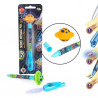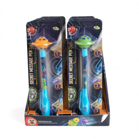 2 i 1 - en galaktisk cool penna! Med denna penna kan du skriva hemliga meddelanden osynligt och de blir synliga igen först när UV-ljuset på locket aktiveras och papperet är upplyst. Så att små och stora hemligheter alltid förblir dolda! Den blå spetsen låter dig också rita och skriva anteckningar. Inkl. utbytbara batterier: 3 x LR41.