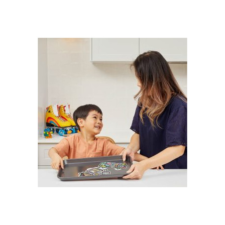 Färglägg bara de överdimensionerade, förskurna mönstren, lägg dem i ugnen och se hur färgerna intensifieras medan berlockerna hårdnar och krymper till mindre än hälften av sin storlek. Fäst sedan de personliga berlockerna på de guldfärgade armbandsdetaljerna. Voilà! Det är kreativt, praktiskt kul med en touch av vetenskaplig magi!