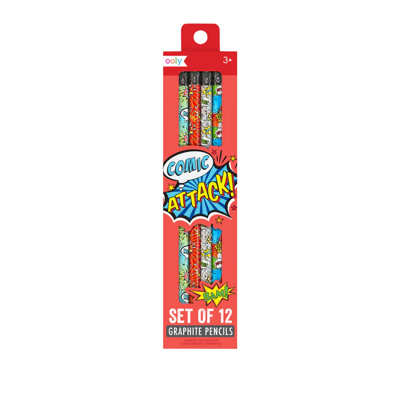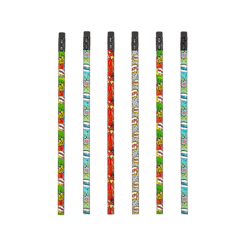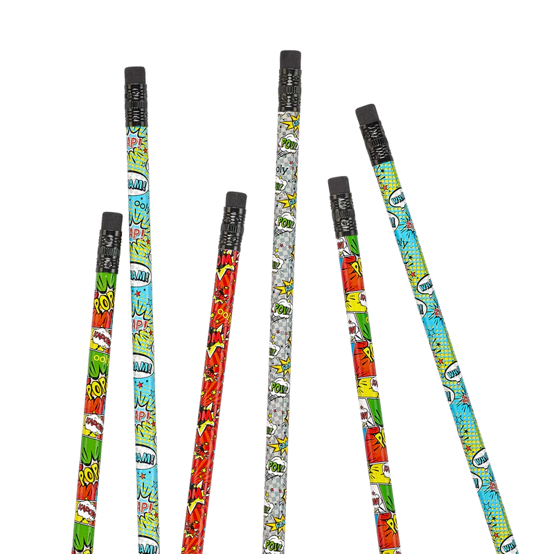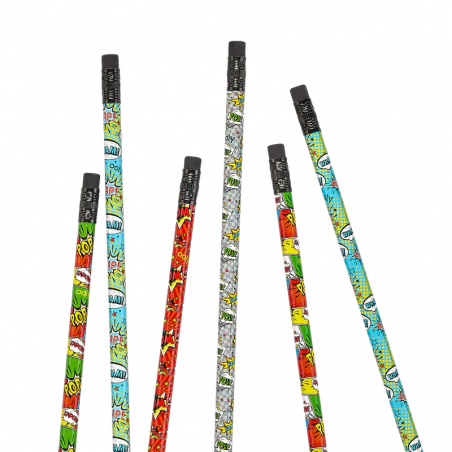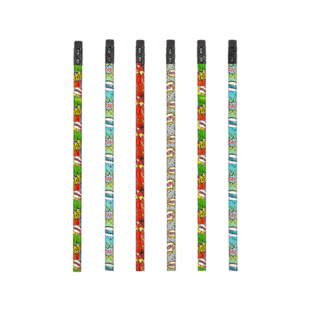 Blyertspennor inspirerade av serietidningar som har en pennspets på ena sidan och sudd på den andra. Perfekt för teckning, skola eller arbete!