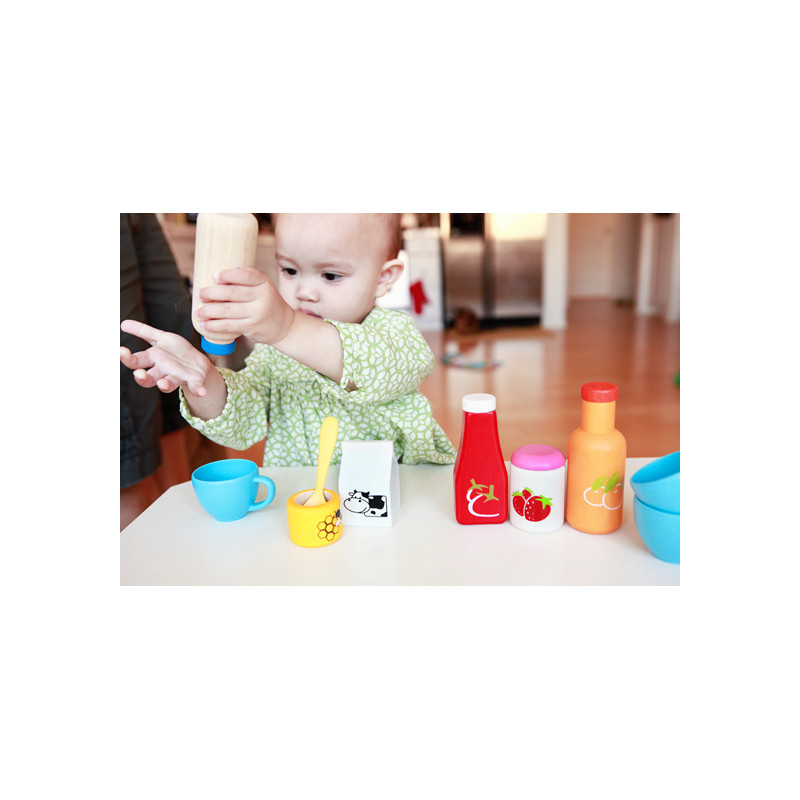 Ett set med matvaror som passar utmärkt till matleken, laga mat eller gå och handla i affären. Paketet innehåller mjölkpaket, juice, vattenflaska, ketchup, marmelad och honung. Ekologisk och giftfri leksak från PlanToy.