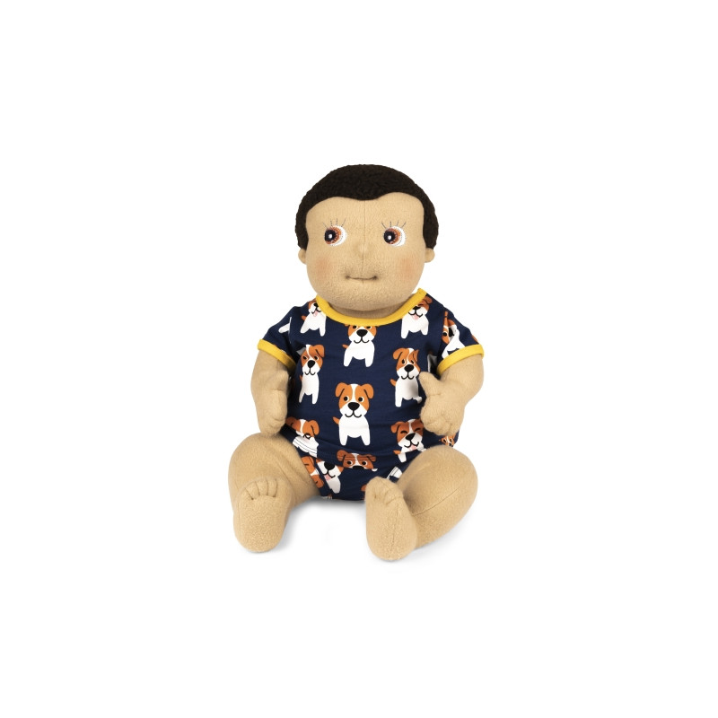 Jag är en mjuk handgjord bebisdocka docka med kortärmad, färgglad t-shirt i mjuk bomullsjersey med kantband i halsen och vid ärmarna. Knäppning med tryckknapp vid vänster axel. Underkläder i mjuk bomullsjersey med elastisk midja. Kläderna har ett härligt tryck bestående av söta hundar.