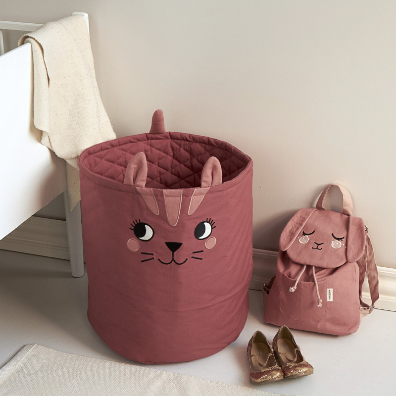En söt och snygg ekologisk ryggsäck för barn, dekorerad som en kanin med långa hängande öron fastsydda på locket och broderade ögon. En praktisk liten ryggsäck med justerbara axelremmar, en ordentlig ögla att bära eller hänga upp ryggsäcken i, ett dragsnöre som stänger till det stora facket samt en liten ficka på utsidan för småsaker. Ryggsäcken är GOTS certifierad och tillverkad av 100% ekologisk bomull. Tvättas i 30°C skontvätt (fintvätt) och hängtorkas vid behov. Torka och förvara ej i direkt solsken. Storlek: ca 27 x 22 x 6 cm.