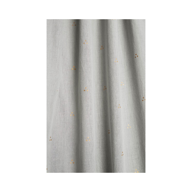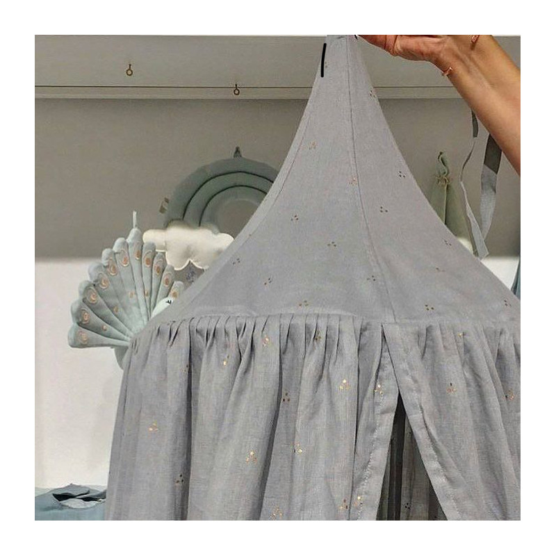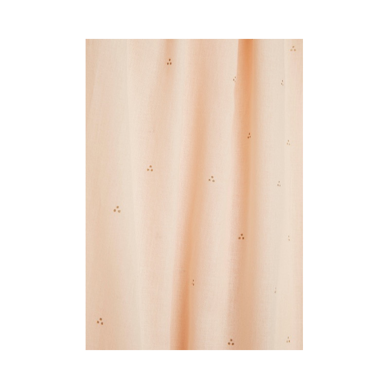 Vacker lite nättare sänghimmel från Danska Cam Cam Copenhagen. Sänghimmeln är fäst på en metallring genom enkla band som man knyter, lätt att ta av vid tvätt. Tyget är ljust aprikos rosa med små guldprickar.