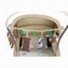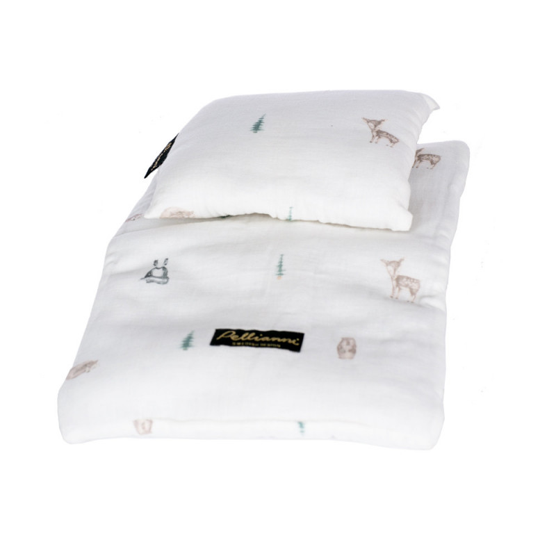 Ett snyggt, ekologiskt och GOTS certifierat bädd set för docksängen, med mönster av granar och olika djur från skogen på vit bakgrund. Setet kommer i en påse av organza och innehåller ett tjockt täcke samt en lätt stoppad kudde. Tillverkat av 100% ekologisk bomullstyg stoppat med 100% polyester fiber. Tvättas i maskin på 40°C och hängtorkas vid behov. Storlek: Kudde - ca 20 x 23 cm, Täcke - ca 40 x 30 cm.