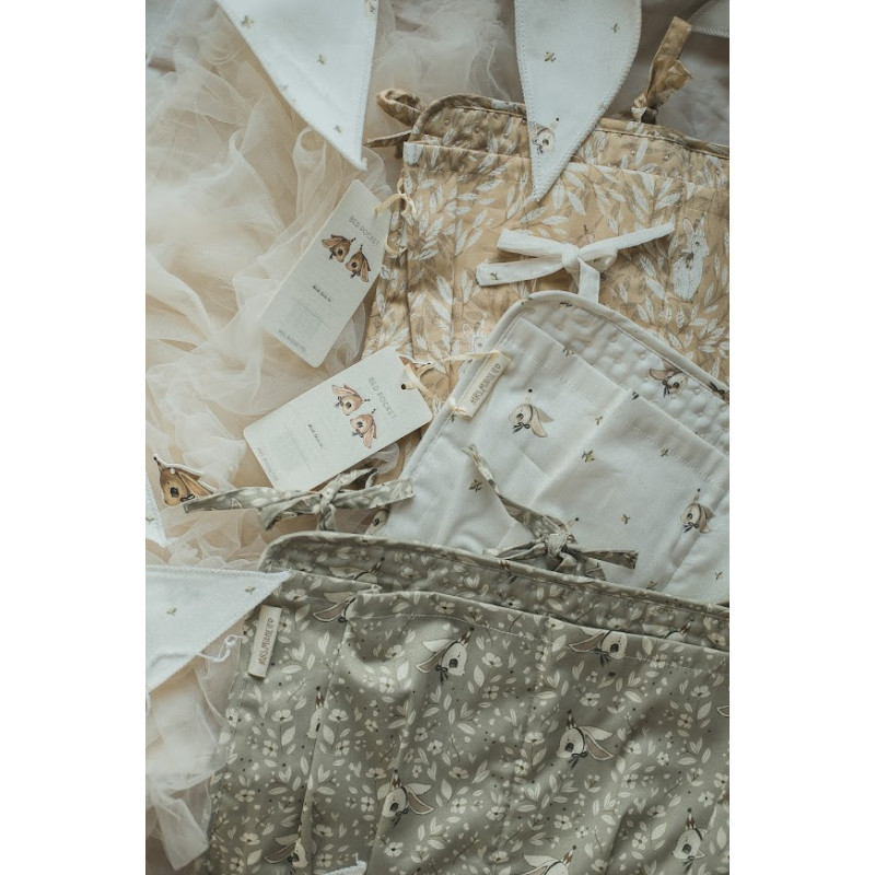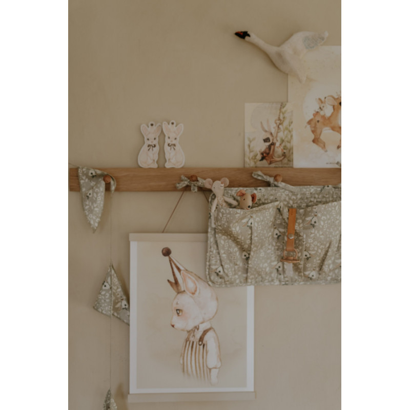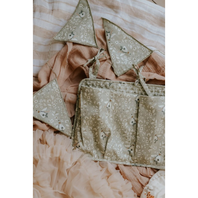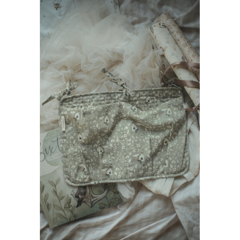 En sängficka tillverkad i OEKO-TEX certifierad bomullssatin där Mrs Mighettos fina motiv pryder tyget. Fäst fickan på spjälsängen eller varför inte på en knopplist på väggen, förvara barnets småsaker så som nappar, leksaker, salvor m.m. Mått: 34.5 x 24.5 cm Material OEKO-TEX certifierad bomullssatin, stoppning polyester.