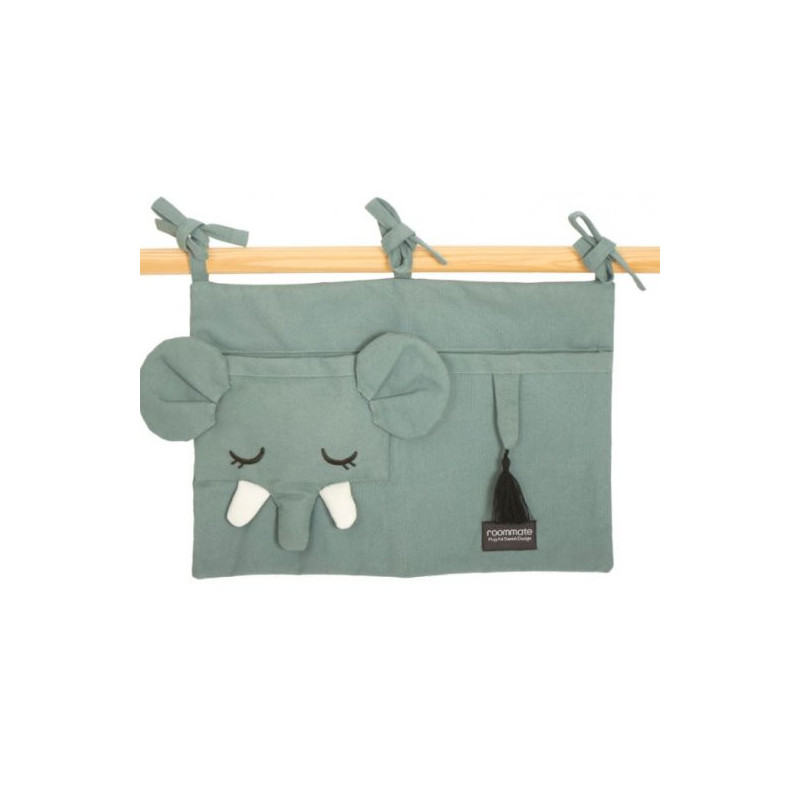 En riktigt snygg förvaring med två fickor i form av en söt elefant att hänga på sidan av sängen eller knyta fast någon annanstans. Tillverkad i OEKO-TEX certifierad ekologisk bomull med applikationer och broderi samt tre uppsättningar knytband att hänga upp förvaringen i.