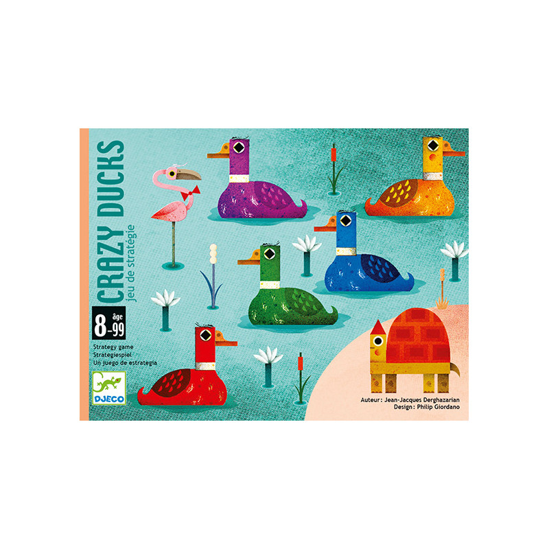 Kul sällskapsspel där du måste använda taktik, minne och addition. Först drar alla kort utan att visa motspelarna tills de får ett kort med en anka - alla kort med ankor i denna färg är nu dina hemliga ankor med tre ben istället för två. Sedan lägger man ut två kort på bordet och alla spelare får tre kort var att spela med. Spelet går sedan ut på att lägga ner två eller tre av sina kort i en lodrät eller vågrät rad intill ett eller flera av de kort som redan ligger där. Nästa spelare på tur säger sedan hur många ben det finns i raden som föregående spelare nyss lagt. Det gäller att avslöja motståndarnas hemliga ankor med 3 ben genom att komma ihåg vad alla sagt och räkna ut vad antalet ben borde ha varit. Innehåller 70 spelkort(5 sköldpaddor, 5 rosa flamingos, och 60 ankor i fem olika färger) samt spelregler på tio språk inklusive svenska. Speltid ungefär 15 minuter.