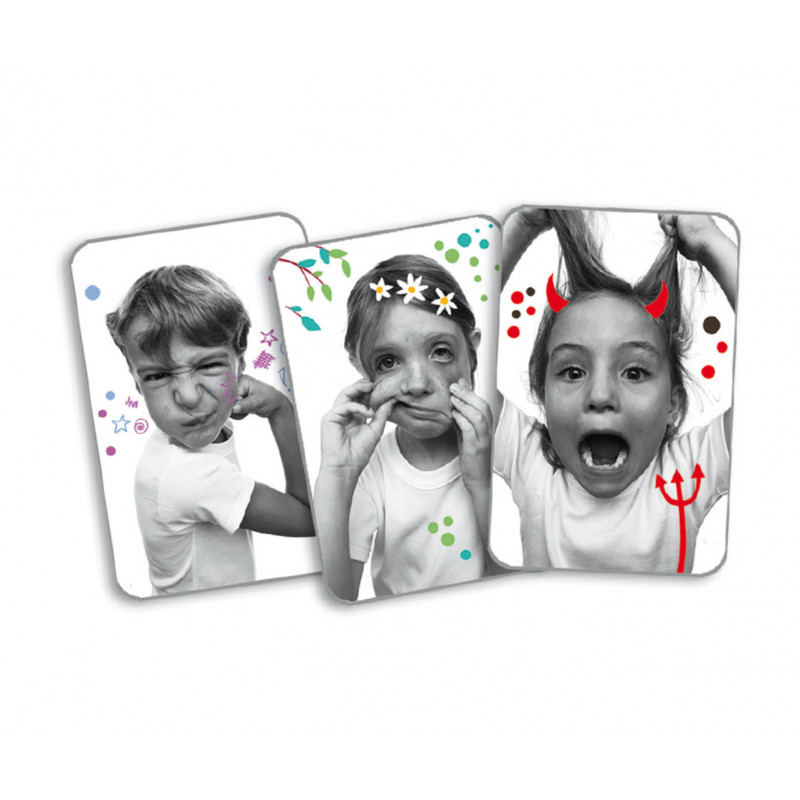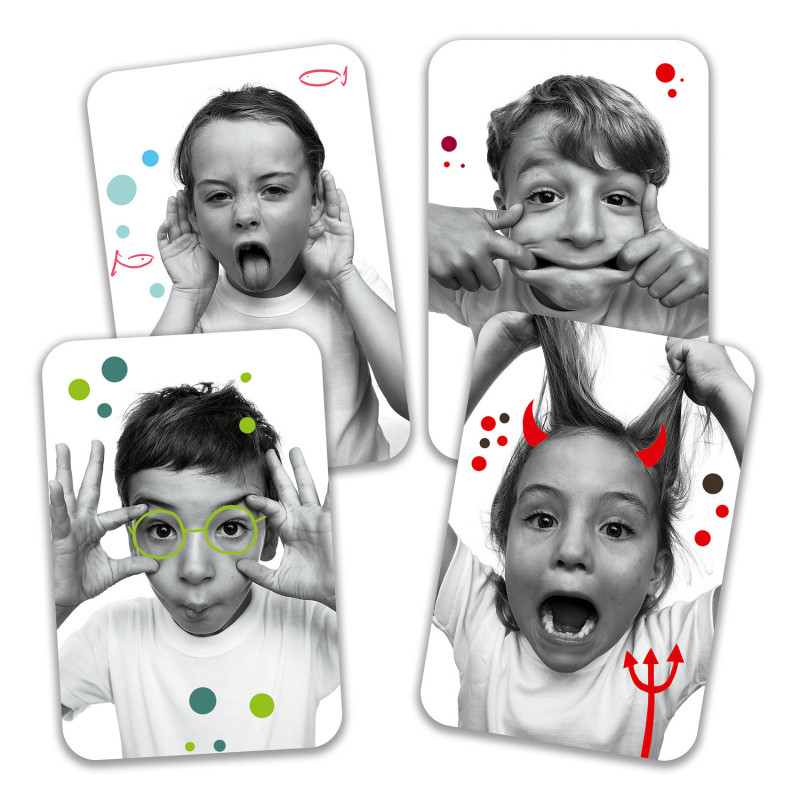 Ett kul minnesspel om att grimasera! Observera, memorera och visa upp att du är en mästare på att grimasera. Gissa vad andra spelare gör för grimas och försök att inte skratta ihjäl dig. Spelet har 72 kort med två färger på baksidan (18 stora och 18 små kort med röd baksida samt 18 stora och 18 små kort med grön baksida) och är i första hand menat att spela med 4 spelare i två lag där man turas om att grimasera och gissa. Det finns dock spelregler för 3 eller 5 spelare också, med en mimare i taget och där resten måste vara först att gissa rätt grimas och ta upp motsvarande kort för att samla poäng. Speltid: ungefär 10 minuter. Spelregler på tio språk inklusive svenska.