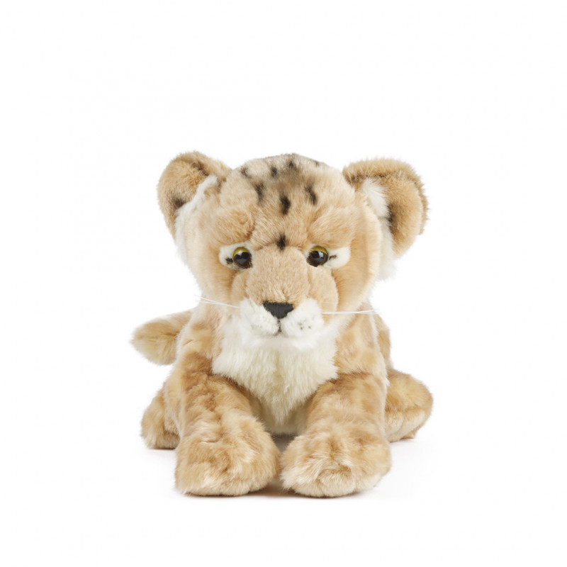 En riktigt söt lejonunge med naturtrogen utformning och ett vänligt uttryck. En riktig raring med ett gulligt och charmigt ansikte, gyllene ögon med stora pupiller, svaga mönster i pälsen som ska kamouflera den lite när den leker, detaljer i fluffig gräddvit päls och en mjuk samt kramgo kropp. Den här versionen av lejonungen ligger ner. En busig men lojal kompis i vått och torrt. Bör ej lämnas utan uppsikt i sängen hos små bebisar. . Storlek: ca H25 x B14 x D47 cm