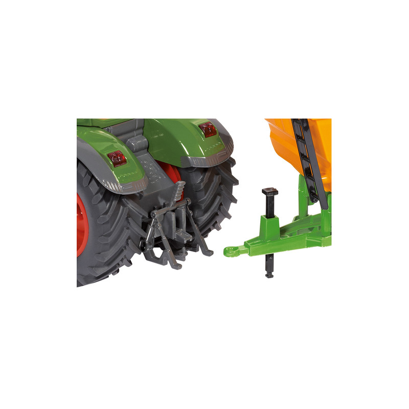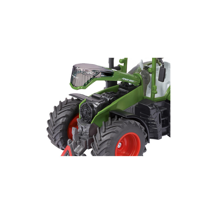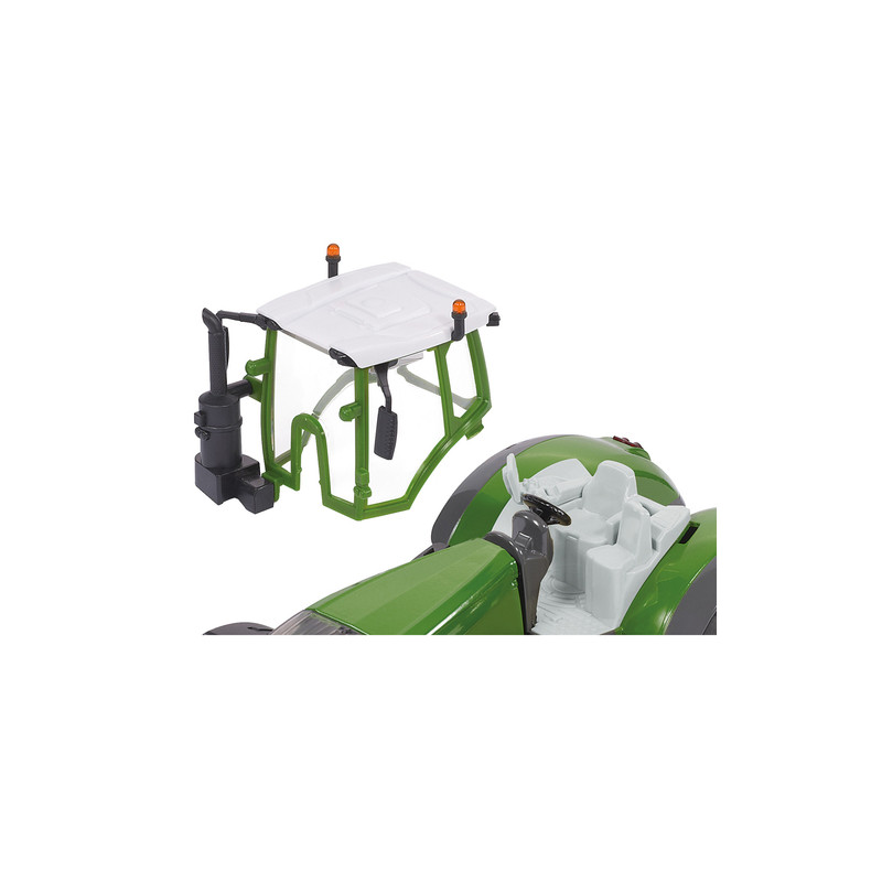 Den här stora traktorn har funktioner såsom dubbel axelstyrning, kopplingar, två roterande, blinkande ljus på taket och speglar som kan vikas in. Förarhytten har sidor av glas och kan tas av.